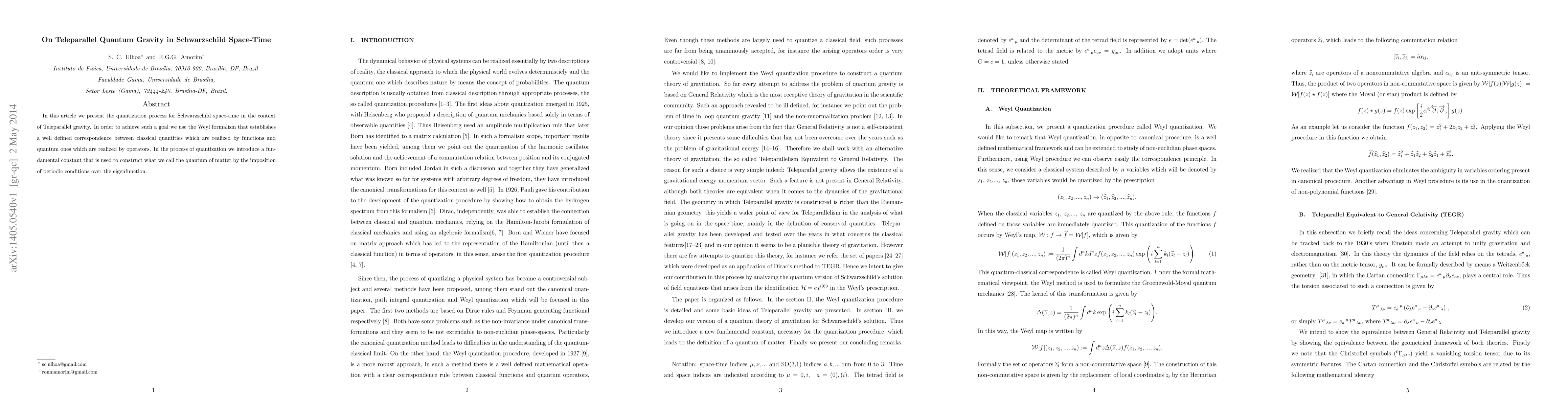 This paper quantizes Schwarzschild space-time within the framework of Teleparallel gravity, employing the Weyl formalism to bridge classical and quantum realms. A fundamental constant is introduced to define the quantum of matter through periodic conditions on the eigenfunction.