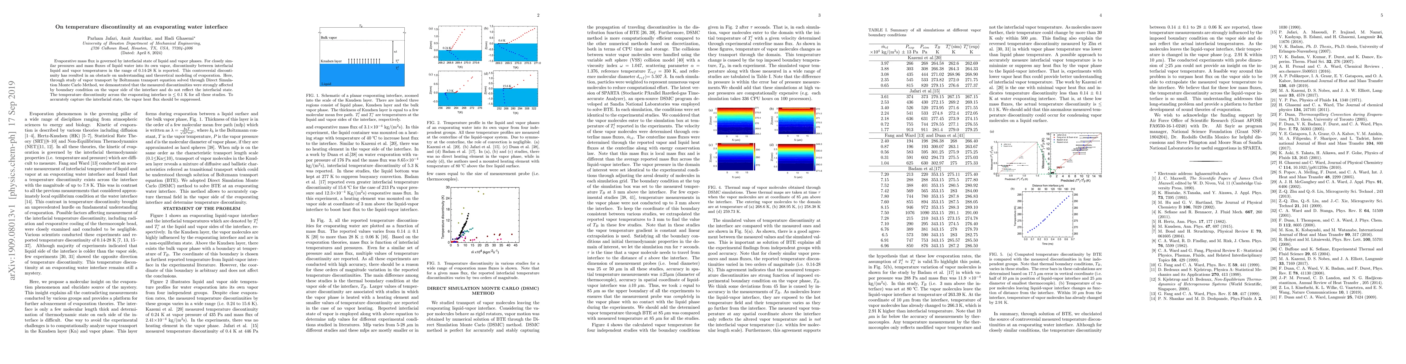 Evaporative mass flux is governed by interfacial state of liquid and vapor phases. For closely similar pressures and mass fluxes of liquid water into its own vapor, discontinuity between interfacial liquid and vapor temperatures in the range of 0.14-28 K is reported. This controversial discontinuity has resulted in an obstacle on understanding and theoretical modeling of evaporation. Here, through study of vapor transport by Boltzmann transport equation solved through Direct Simulation Monte Carlo Method, we demonstrated that the measured discontinuities were strongly affected by boundary condition on the vapor side of the interface and do not reflect the interfacial state. The temperature discontinuity across the evaporating interface is < 0.1 K for all these studies. To accurately capture the interfacial state, the vapor heat flux should be suppressed.