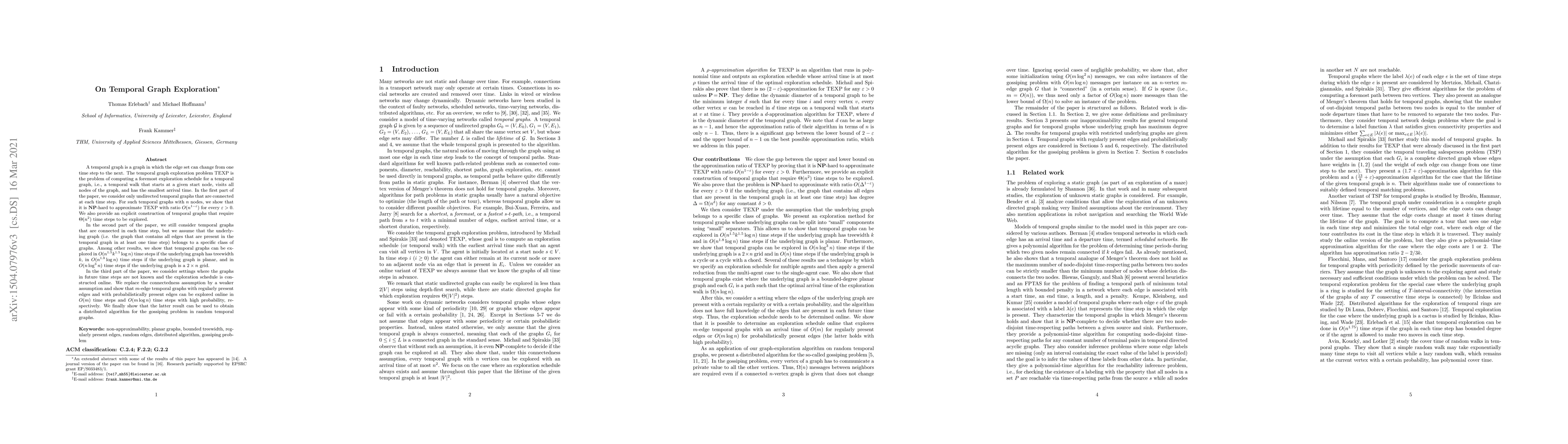 This paper explores the temporal graph exploration problem (TEXP), focusing on computing an optimal exploration schedule. It proves TEXP is \NP-hard to approximate for undirected temporal graphs, and constructs examples requiring $\Theta(n^2)$ time steps for exploration. It also presents efficient exploration algorithms for temporal graphs based on the underlying graph's treewidth, planarity, and grid structure. Finally, it discusses online exploration strategies for unknown future graphs and applies the results to a distributed gossiping algorithm.