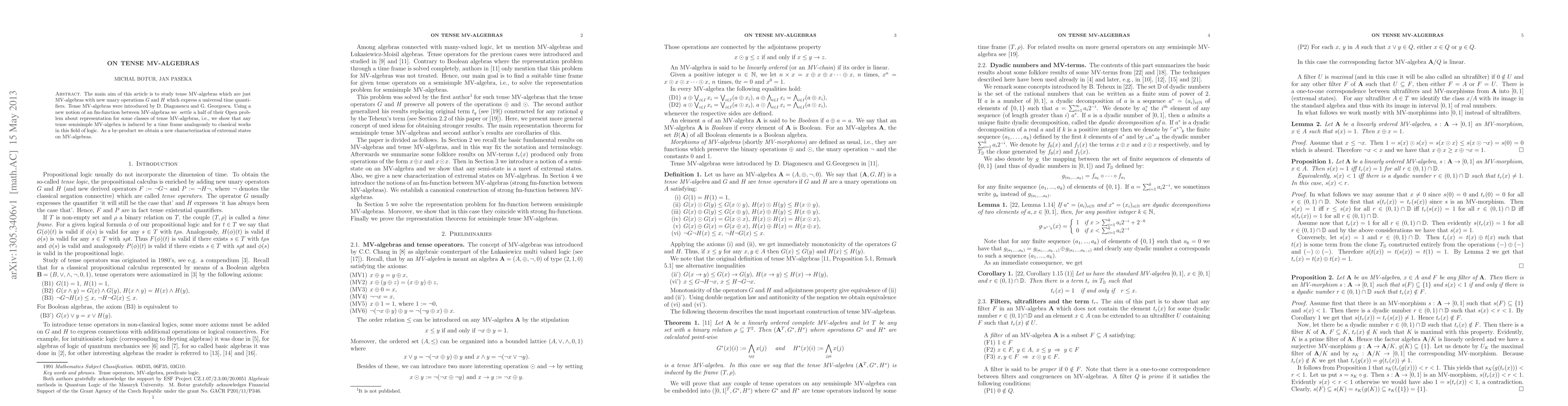 The main aim of this article is to study tense MV-algebras which are just MV-algebras with new unary operations $G$ and $H$ which express a universal time quantifiers. Tense MV-algebras were introduced by D. Diagonescu and G. Georgescu. Using a new notion of an fm-function between MV-algebras we \zruseno{will prove} \zmena{settle a half of their Open problem about representation for some classes of tense MV-algebras, i.e., we show} that any tense semisimple MV-algebra is induced by a time frame analogously to classical works in this field of logic. As a by-product we obtain a new characterization of extremal states on MV-algebras.