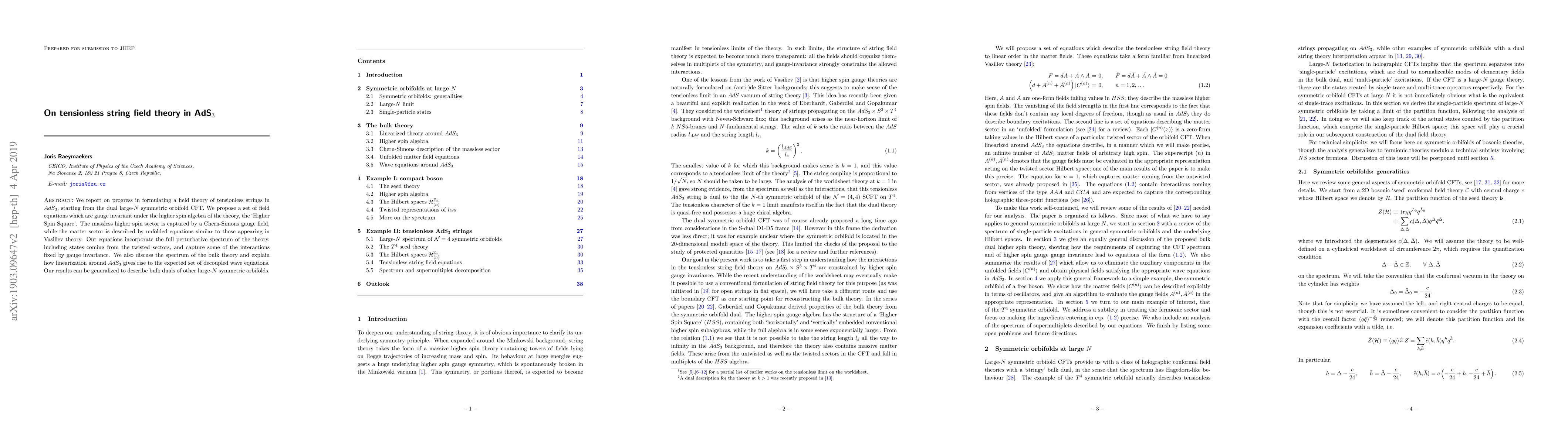 We report on progress in formulating a field theory of tensionless strings in $AdS_3$, starting from the dual large-$N$ symmetric orbifold CFT. We propose a set of field equations which are gauge invariant under the higher spin algebra of the theory, the `Higher Spin Square'. The massless higher spin sector is captured by a Chern-Simons gauge field, while the matter sector is described by unfolded equations similar to those appearing in Vasiliev theory. Our equations incorporate the full perturbative spectrum of the theory, including states coming from the twisted sectors, and capture some of the interactions fixed by gauge invariance. We also discuss the spectrum of the bulk theory and explain how linearization around $AdS_3$ gives rise to the expected set of decoupled wave equations. Our results can be generalized to describe bulk duals of other large-$N$ symmetric orbifolds.