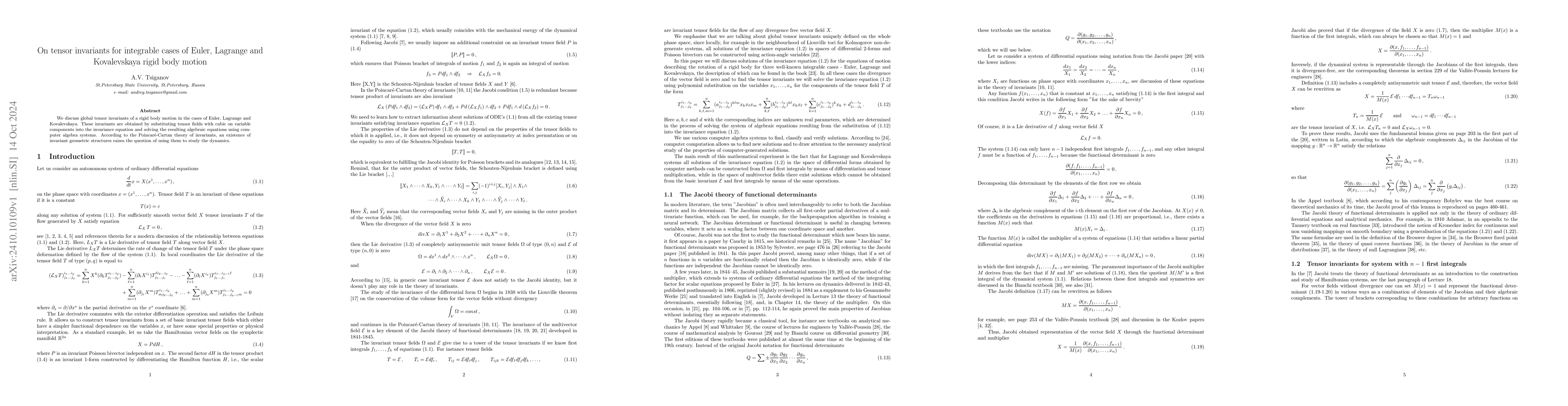 Summary: This paper investigates global tensor invariants for Euler, Lagrange, and Kovalevskaya cases of rigid body motion by solving algebraic equations derived from invariance equations, potentially aiding the study of dynamics according to Poincaré-Cartan theory.