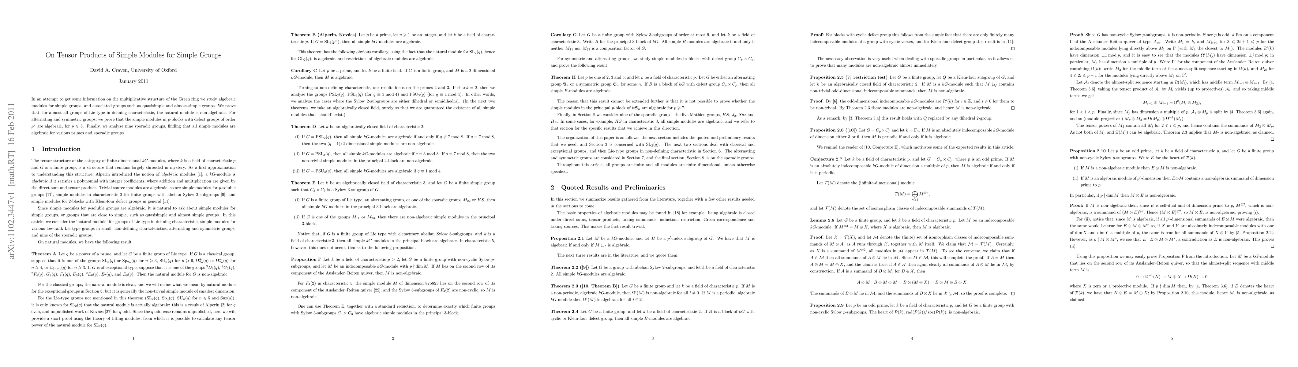 Summary: This paper explores tensor products of simple modules for simple, quasisimple, and almost-simple groups, proving that natural modules are non-algebraic for most groups of Lie type and that simple modules in certain $p$-blocks for alternating and symmetric groups are algebraic for small primes. It concludes with an analysis of sporadic groups, finding all simple modules to be algebraic.