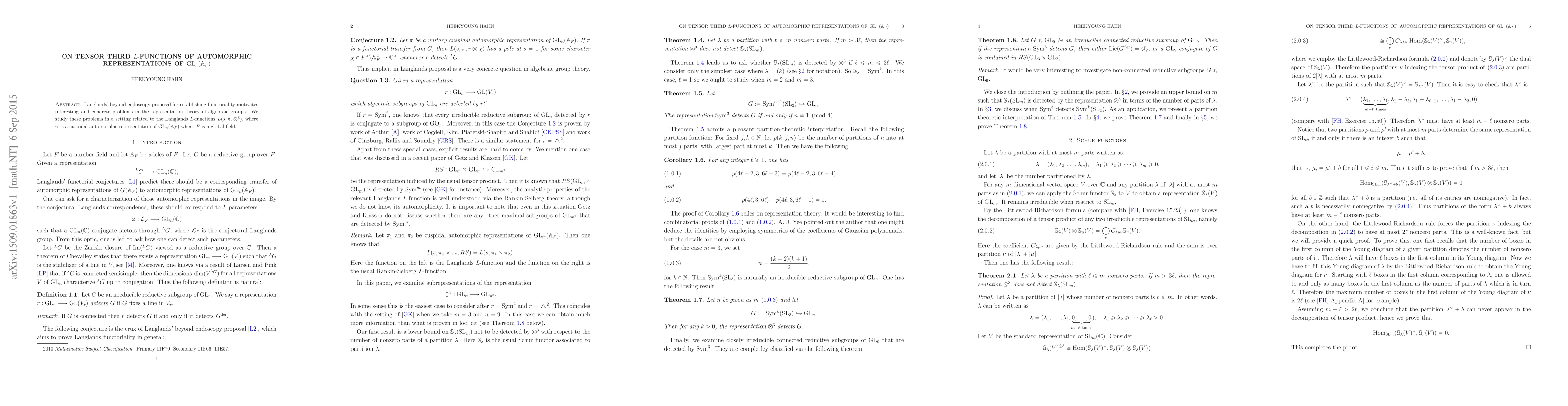This paper explores tensor third $L$-functions associated with cuspidal automorphic representations of $\mathrm{GL}_n(\mathbb{A}_F)$, focusing on representation theory implications of Langlands' beyond endoscopy proposal for establishing functoriality.