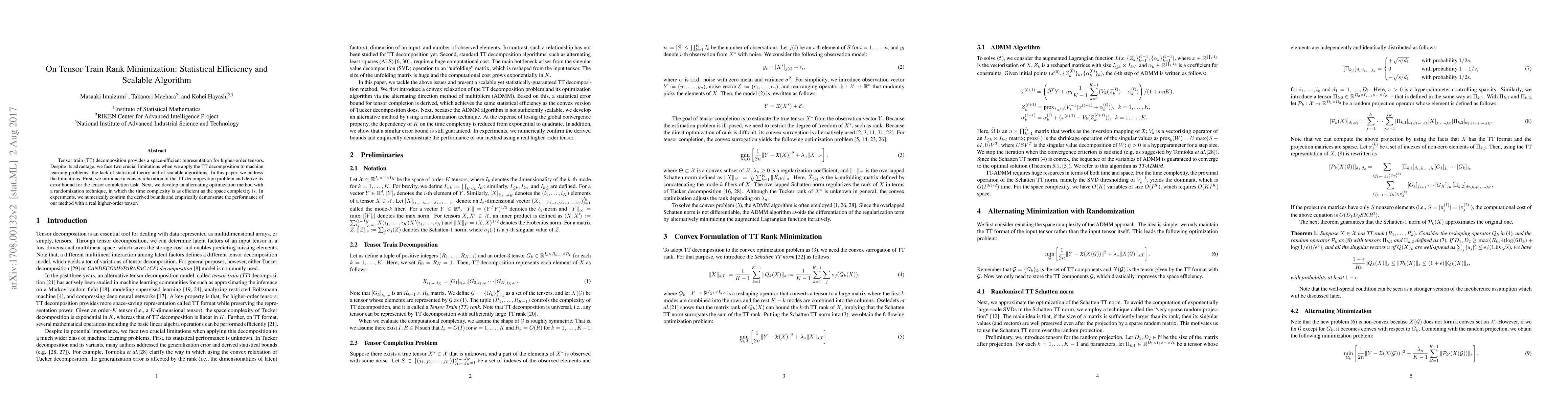 Tensor train (TT) decomposition provides a space-efficient representation for higher-order tensors. Despite its advantage, we face two crucial limitations when we apply the TT decomposition to machine learning problems: the lack of statistical theory and of scalable algorithms. In this paper, we address the limitations. First, we introduce a convex relaxation of the TT decomposition problem and derive its error bound for the tensor completion task. Next, we develop an alternating optimization method with a randomization technique, in which the time complexity is as efficient as the space complexity is. In experiments, we numerically confirm the derived bounds and empirically demonstrate the performance of our method with a real higher-order tensor.