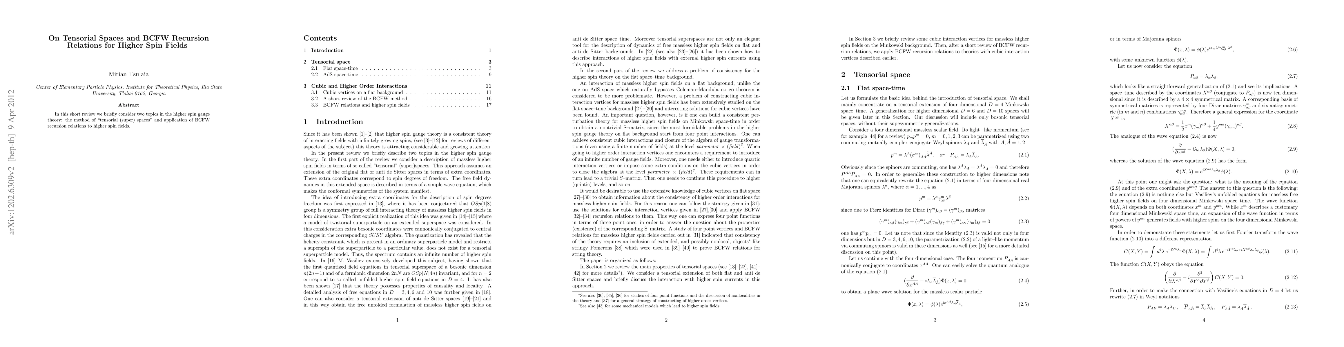 This paper reviews the "tensorial (super) spaces" method in higher spin gauge theory and applies the BCFW recursion relations to higher spin fields to explore their properties and interactions.