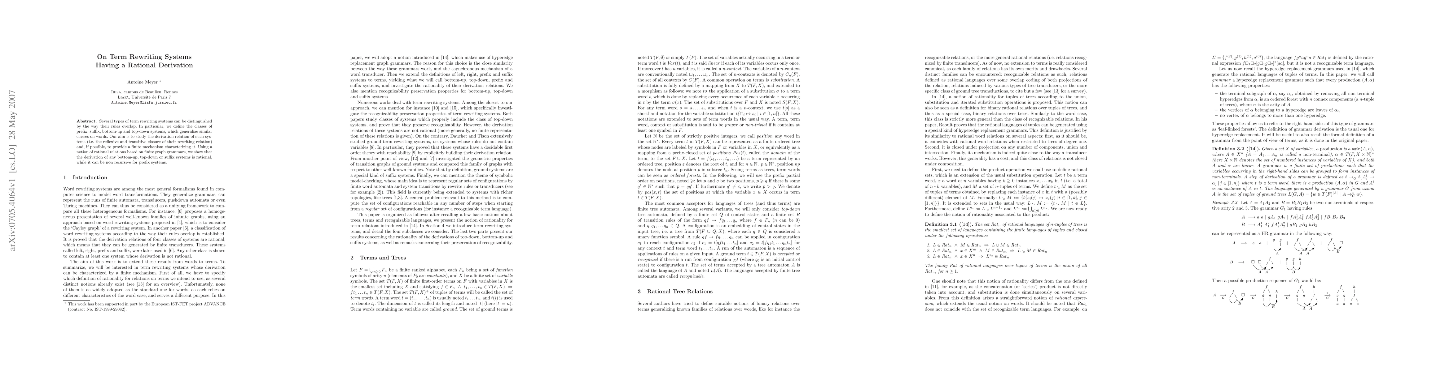 This paper classifies term rewriting systems into prefix, suffix, bottom-up, and top-down types, and studies their derivation relations. It demonstrates that the derivations of bottom-up, top-down, and suffix systems are rational, while those of prefix systems can be non-recursive.