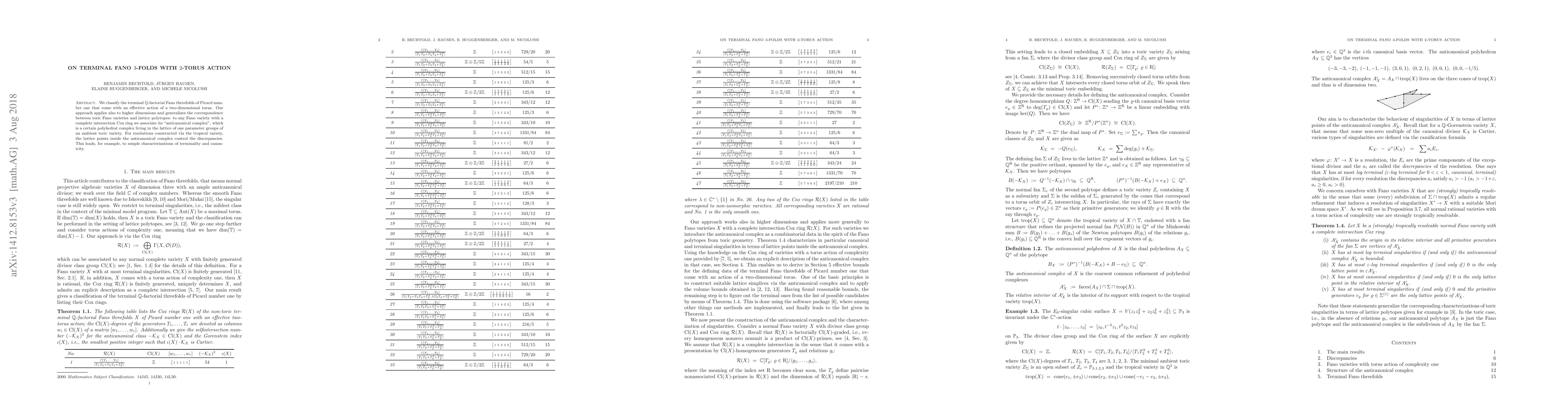 The paper classifies terminal Fano 3-folds with a single Picard number and a two-torus action, utilizing a method generalizable to higher dimensions. It introduces an "anti canonical complex" associated with Fano varieties with complete intersection Cox rings, linking terminality and canonicity to lattice points within this complex.