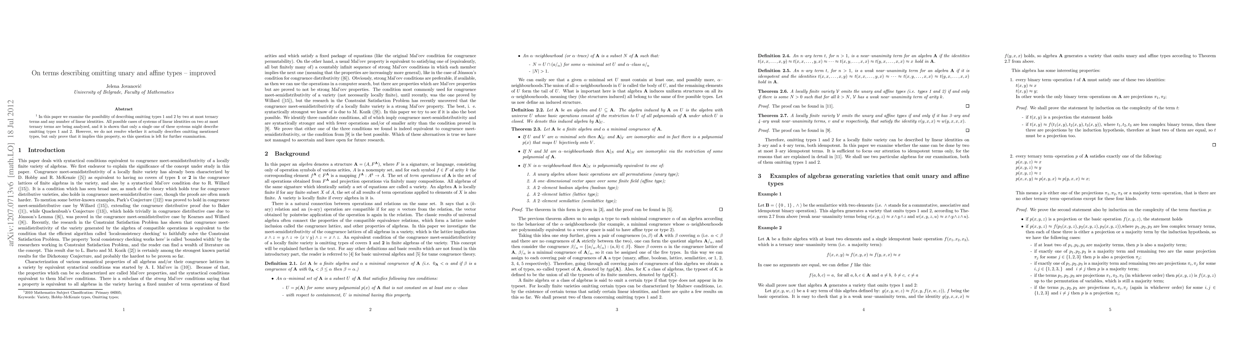 In this paper we examine the possibility of describing omitting types 1 and 2 by two at most ternary terms and any number of linear identities. All possible cases of systems of linear identities on two at most ternary terms are being analyzed, and it is shown that only a single one of these systems might describe omitting types 1 and 2. However, we do not resolve whether it actually describes omitting mentioned types, but only prove that it implies this property, so this question is left for further examination.