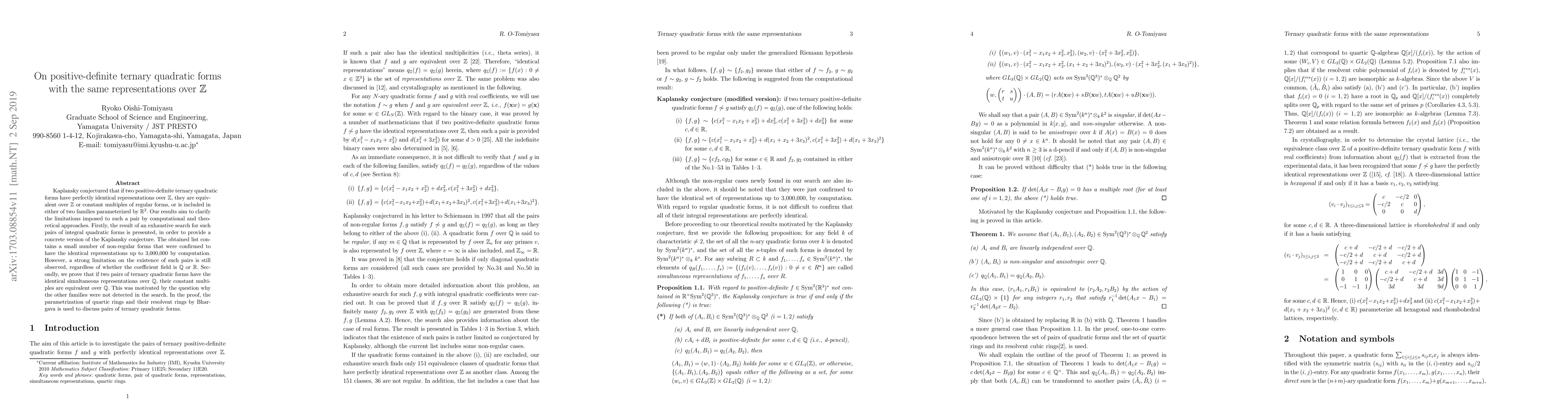 This paper investigates Kaplansky's conjecture regarding the representations of positive-definite ternary quadratic forms over $\mathbb{Z}$, confirming a limited number of non-regular forms with identical representations. It also proves that pairs of such forms with identical representations over $\mathbb{Q}$ are equivalent over $\mathbb{Q}$, using Bhargava's parametrization of quartic rings.