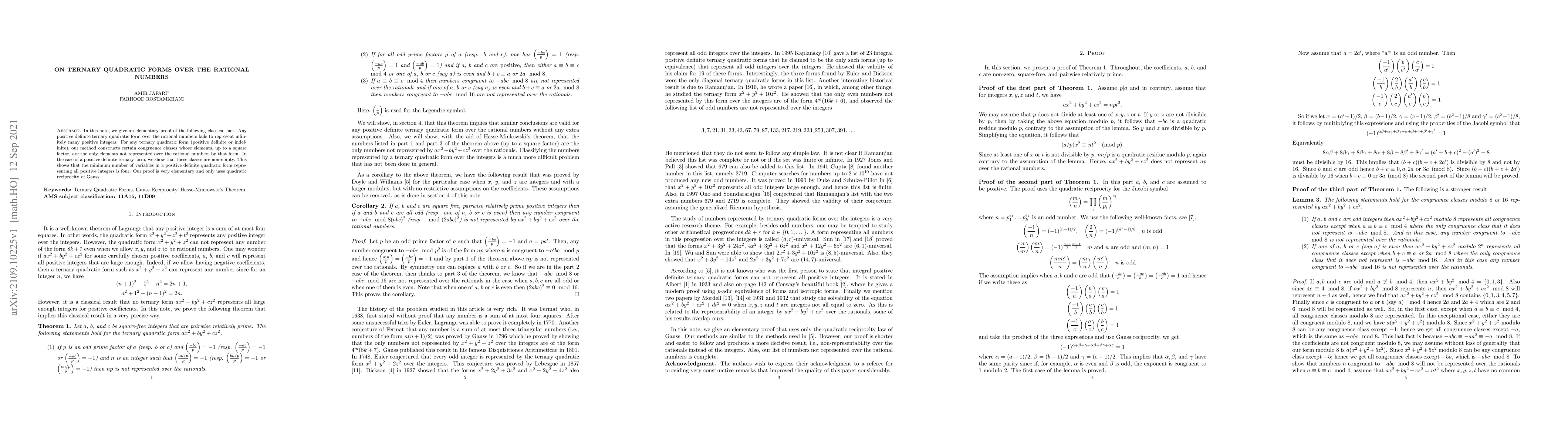 In this note, we give an elementary proof of the following classical fact. Any positive definite ternary quadratic form over the rational numbers fails to represent infinitely many positive integers. For any ternary quadratic form (positive definite or indefinite), our method constructs certain congruence classes whose elements, up to a square factor, are the only elements not represented over the rational numbers by that form. In the case of a positive definite ternary form, we show that these classes are non-empty. This shows that the minimum number of variables in a positive definite quadratic form representing all positive integers is four. Our proof is very elementary and only uses quadratic reciprocity of Gauss.