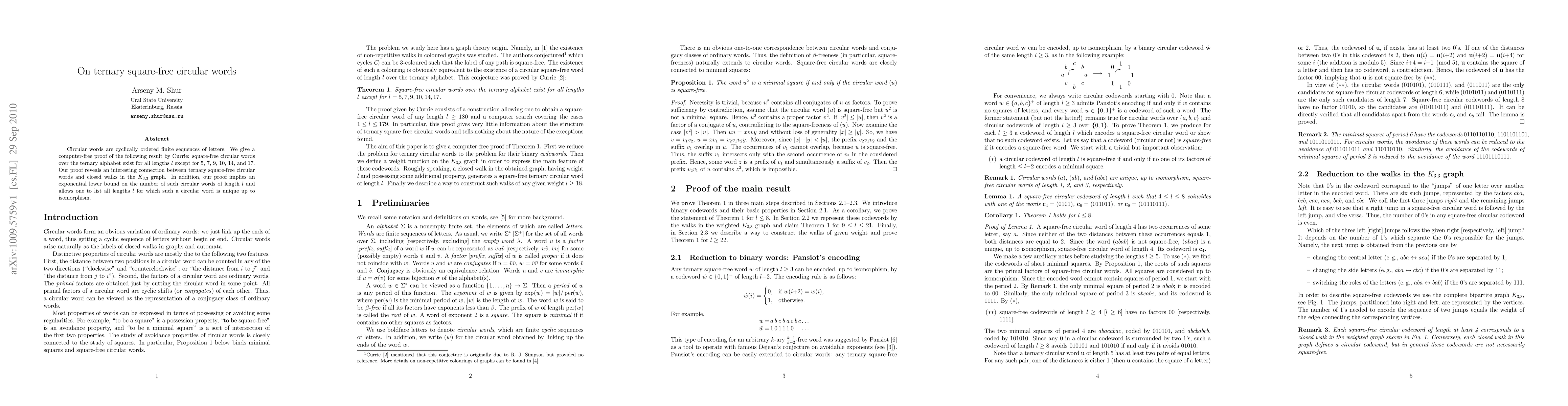 Circular words are cyclically ordered finite sequences of letters. We give a computer-free proof of the following result by Currie: square-free circular words over the ternary alphabet exist for all lengths $l$ except for 5, 7, 9, 10, 14, and 17. Our proof reveals an interesting connection between ternary square-free circular words and closed walks in the $K_{3{,}3}$ graph. In addition, our proof implies an exponential lower bound on the number of such circular words of length $l$ and allows one to list all lengths $l$ for which such a circular word is unique up to isomorphism.