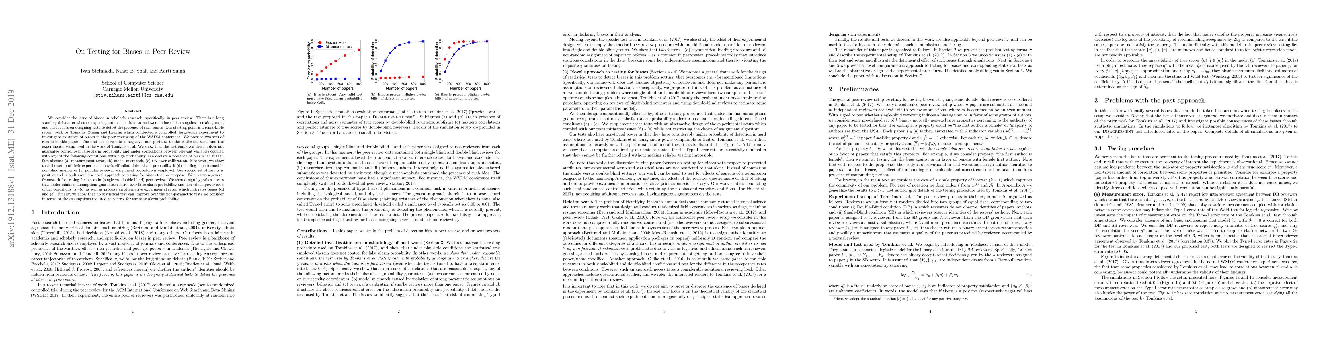 We consider the issue of biases in scholarly research, specifically, in peer review. There is a long standing debate on whether exposing author identities to reviewers induces biases against certain groups, and our focus is on designing tests to detect the presence of such biases. Our starting point is a remarkable recent work by Tomkins, Zhang and Heavlin which conducted a controlled, large-scale experiment to investigate existence of biases in the peer reviewing of the WSDM conference. We present two sets of results in this paper. The first set of results is negative, and pertains to the statistical tests and the experimental setup used in the work of Tomkins et al. We show that the test employed therein does not guarantee control over false alarm probability and under correlations between relevant variables coupled with any of the following conditions, with high probability, can declare a presence of bias when it is in fact absent: (a) measurement error, (b) model mismatch, (c) reviewer calibration. Moreover, we show that the setup of their experiment may itself inflate false alarm probability if (d) bidding is performed in non-blind manner or (e) popular reviewer assignment procedure is employed. Our second set of results is positive and is built around a novel approach to testing for biases that we propose. We present a general framework for testing for biases in (single vs. double blind) peer review. We then design hypothesis tests that under minimal assumptions guarantee control over false alarm probability and non-trivial power even under conditions (a)--(c) as well as propose an alternative experimental setup which mitigates issues (d) and (e). Finally, we show that no statistical test can improve over the non-parametric tests we consider in terms of the assumptions required to control for the false alarm probability.