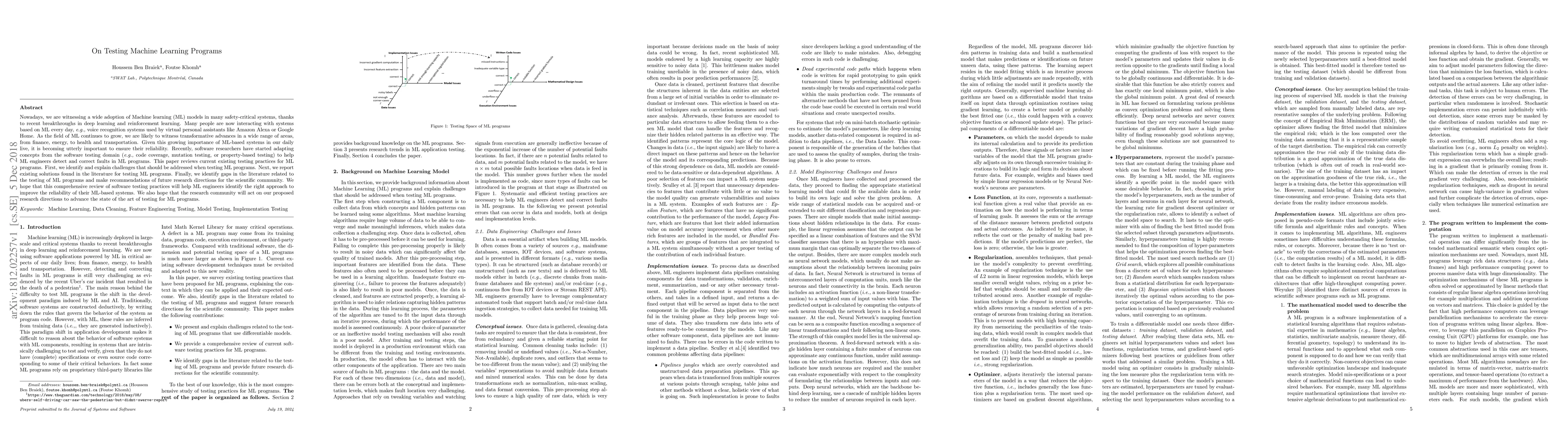 Nowadays, we are witnessing a wide adoption of Machine learning (ML) models in many safety-critical systems, thanks to recent breakthroughs in deep learning and reinforcement learning. Many people are now interacting with systems based on ML every day, e.g., voice recognition systems used by virtual personal assistants like Amazon Alexa or Google Home. As the field of ML continues to grow, we are likely to witness transformative advances in a wide range of areas, from finance, energy, to health and transportation. Given this growing importance of ML-based systems in our daily life, it is becoming utterly important to ensure their reliability. Recently, software researchers have started adapting concepts from the software testing domain (e.g., code coverage, mutation testing, or property-based testing) to help ML engineers detect and correct faults in ML programs. This paper reviews current existing testing practices for ML programs. First, we identify and explain challenges that should be addressed when testing ML programs. Next, we report existing solutions found in the literature for testing ML programs. Finally, we identify gaps in the literature related to the testing of ML programs and make recommendations of future research directions for the scientific community. We hope that this comprehensive review of software testing practices will help ML engineers identify the right approach to improve the reliability of their ML-based systems. We also hope that the research community will act on our proposed research directions to advance the state of the art of testing for ML programs.