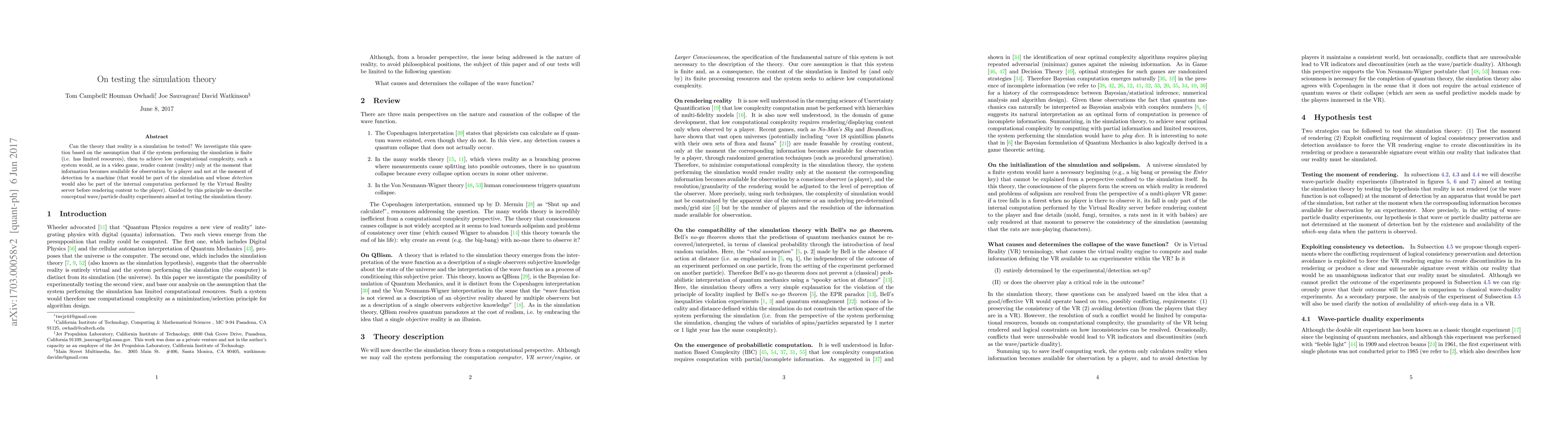 This paper proposes testing the simulation theory by designing experiments that exploit the assumed limitation of a finite, resource-constrained simulation system. It suggests that such a system would render reality only upon observation, unlike continuous machine monitoring. The authors outline conceptual wave/particle duality experiments to validate this theory.