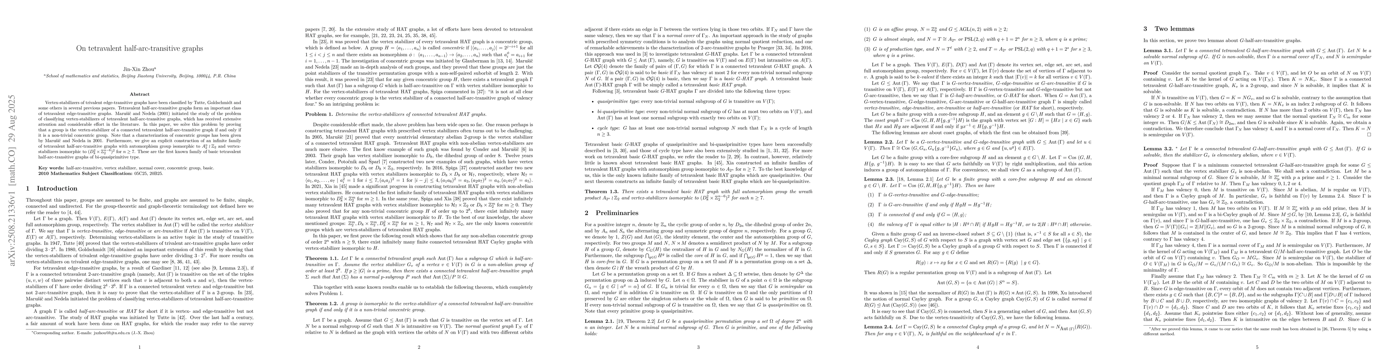 Vertex-stabilizers of trivalent edge-transitive graphs have been classified by Tutte, Goldschmidt and some others in several previous papers. Tetravalent half-arc-transitive graphs form an important class of tetravalent edge-transitive graphs. Maru\v{s}i\v{c} and Nedela (2001) initiated the study of the problem of classifying vertex-stabilizers of tetravalent half-arc-transitive graphs, which has received extensive attention and considerable effort in the literature. In this paper, we solve this problem by proving that a group is the vertex-stabilizer of a connected tetravalent half-arc-transitive graph if and only if it is a non-trivial concentric group. Note that a characterization of concentric groups has been given by Maru\v{s}i\v{c} and Nedela in 2001. Furthermore, we give an explicit construction of an infinite family of tetravalent half-arc-transitive graphs with automorphism group isomorphic to $A_{2^n}\wr \mathbb{Z}_2$ and vertex-stabilizers isomorphic to $(D_8^2\times\mathbb{Z}_{2}^{n-6})^2$ for $n\geq7$. These are the first known family of basic tetravalent half-arc-transitive graphs of bi-quasiprimitive type.