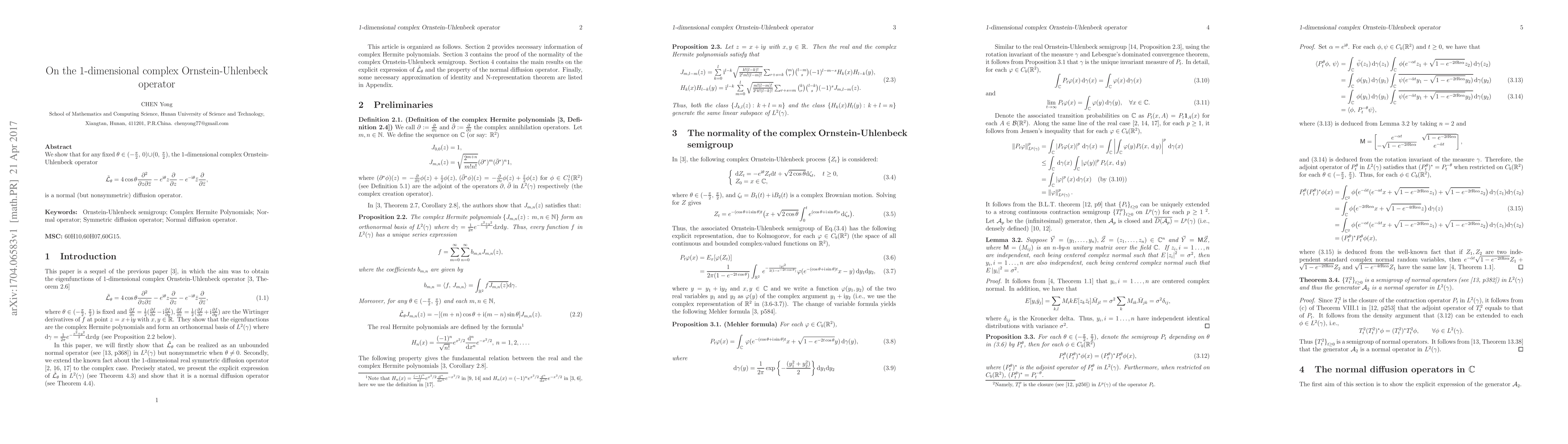 We show that for any fixed $\theta\in(-\frac{\pi}{2},\,0)\cup (0,\,\frac{\pi}{2})$, the 1-dimensional complex Ornstein-Uhlenbeck operator \begin{equation*} \tilde{\mathcal{L}}_{\theta}= 4\cos\theta \frac{\partial^2}{\partial z\partial \bar{z}}-e^{\mi\theta} z \frac{\partial}{\partial z}-e^{-\mi\theta}\bar{z} \frac{\partial}{\partial \bar{z}}, \end{equation*} is a normal (but nonsymmetric) diffusion operator.