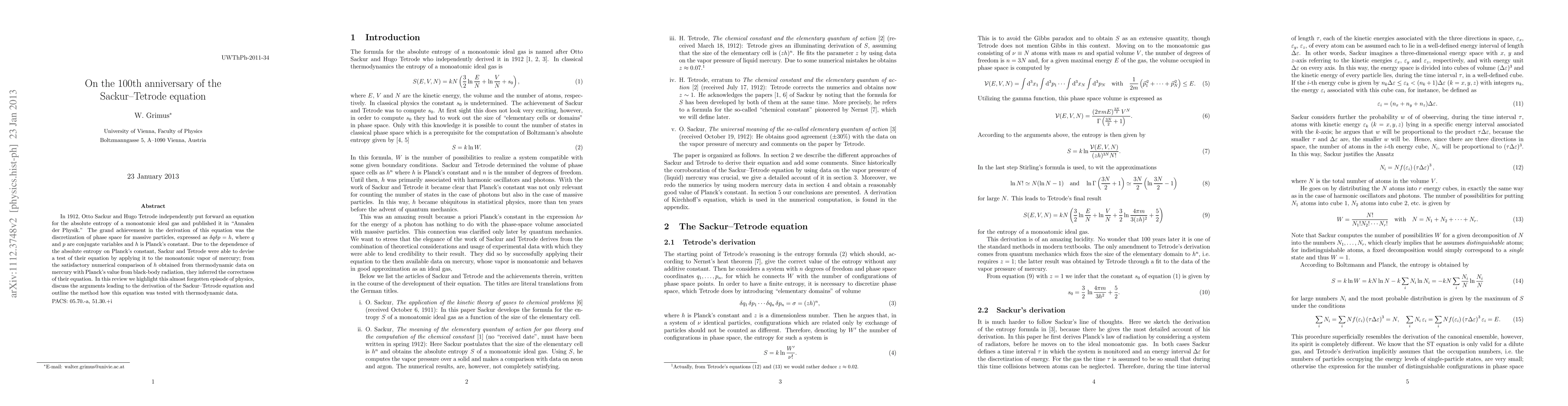 This paper commemorates the 100th anniversary of the Sackur-Tetrode equation, highlighting its derivation through the discretization of phase space and its validation via mercury vapor data, marking a significant contribution to the understanding of entropy in ideal gases.
