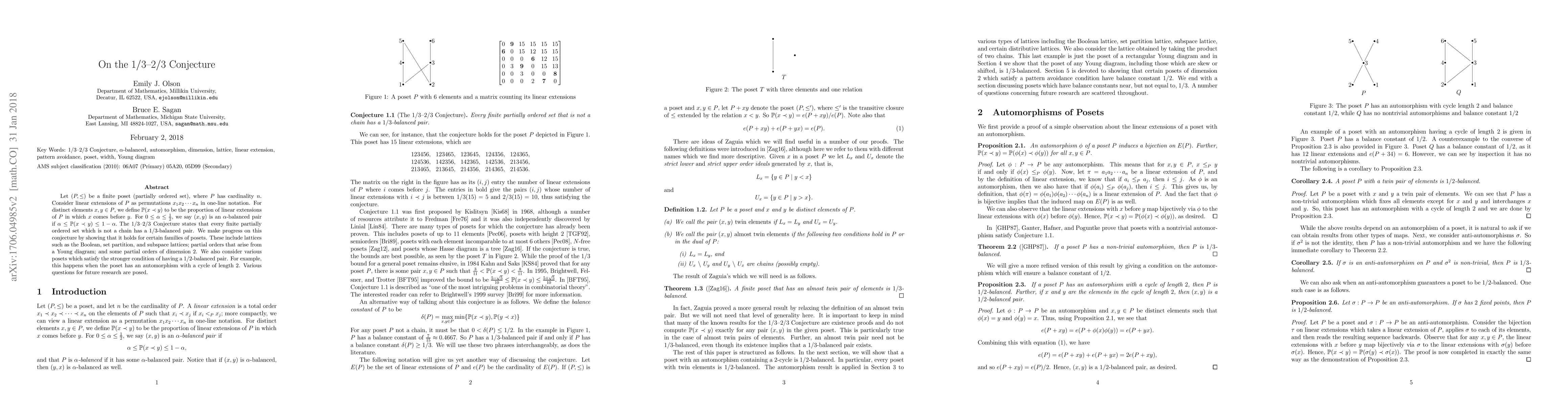 Let $(P,\leq)$ be a finite poset (partially ordered set), where $P$ has cardinality $n$. Consider linear extensions of $P$ as permutations $x_1x_2\cdots x_n$ in one-line notation. For distinct elements $x,y\in P$, we define $\mathbb{P}(x\prec y)$ to be the proportion of linear extensions of $P$ in which $x$ comes before $y$. For $0\leq \alpha \leq \frac{1}{2}$, we say $(x,y)$ is an $\alpha$-balanced pair if $\alpha \leq \mathbb{P}(x\prec y) \leq 1-\alpha.$ The $1/3-2/3$ Conjecture states that every finite partially ordered set which is not a chain has a $1/3$-balanced pair. We make progress on this conjecture by showing that it holds for certain families of posets. These include lattices such as the Boolean, set partition, and subspace lattices; partial orders that arise from a Young diagram; and some partial orders of dimension $2$. We also consider various posets which satisfy the stronger condition of having a $1/2$-balanced pair. For example, this happens when the poset has an automorphism with a cycle of length $2$. Various questions for future research are posed.