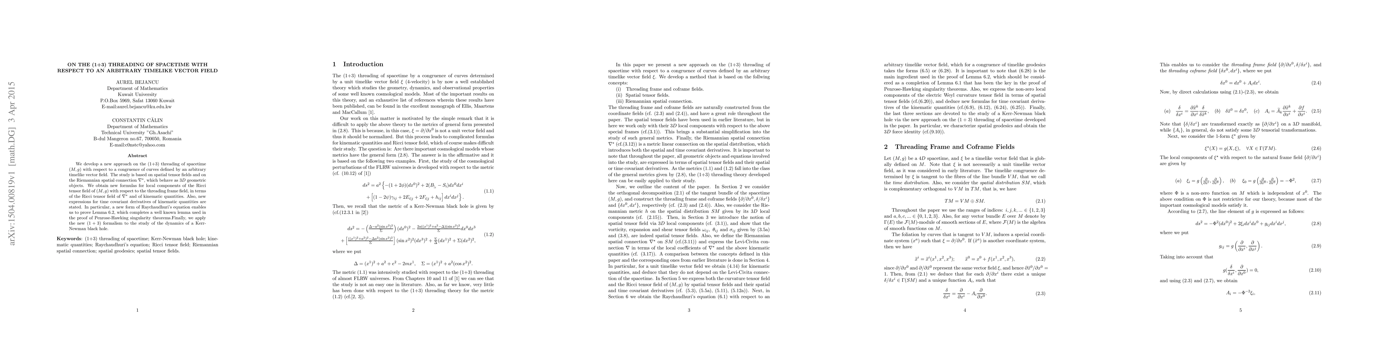 We develop a new approach on the (1+3) threading of spacetime $(M, g)$ with respect to a congruence of curves defined by an arbitrary timelike vector field. The study is based on spatial tensor fields and on the Riemannian spatial connection $\nabla^{\star}$, which behave as $3D$ geometric objects. We obtain new formulas for local components of the Ricci tensor field of $(M, g)$ with respect to the threading frame field, in terms of the Ricci tensor field of $\nabla^{\star}$ and of kinematic quantities. Also, new expressions for time covariant derivatives of kinematic quantities are stated. In particular, a new form of Raychaudhuri's equation enables us to prove Lemma 6.2, which completes a well known lemma used in the proof of Penrose-Hawking singularity theorems.Finally, we apply the new $(1+3)$ formalism to the study of the dynamics of a Kerr-Newman black hole.