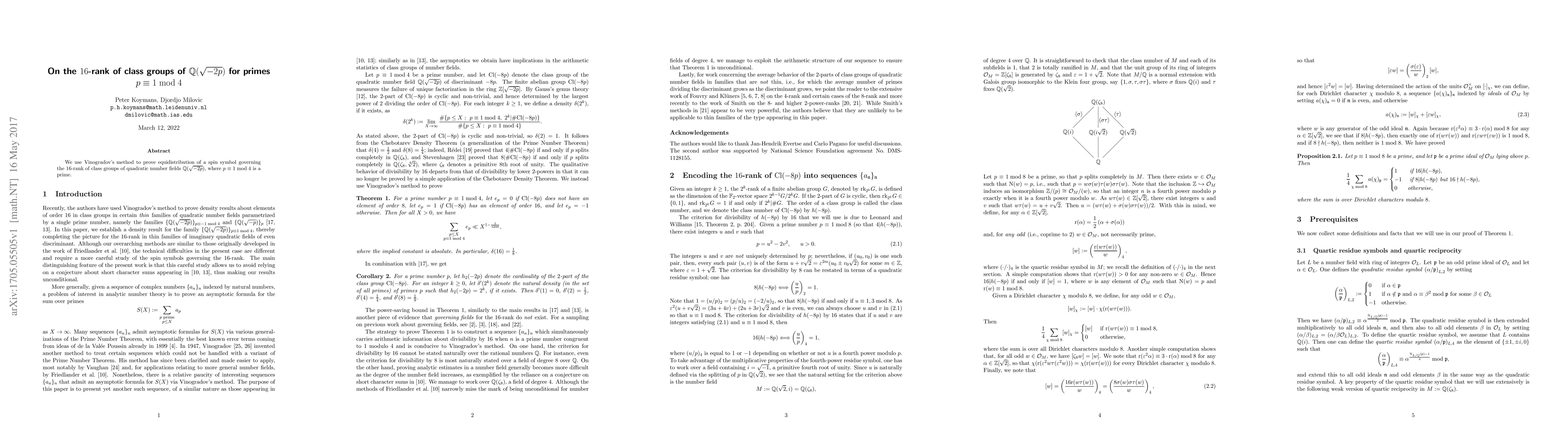 We use Vinogradov's method to prove equidistribution of a spin symbol governing the $16$-rank of class groups of quadratic number fields $\mathbb{Q}(\sqrt{-2p})$, where $p \equiv 1 \bmod 4$ is a prime.