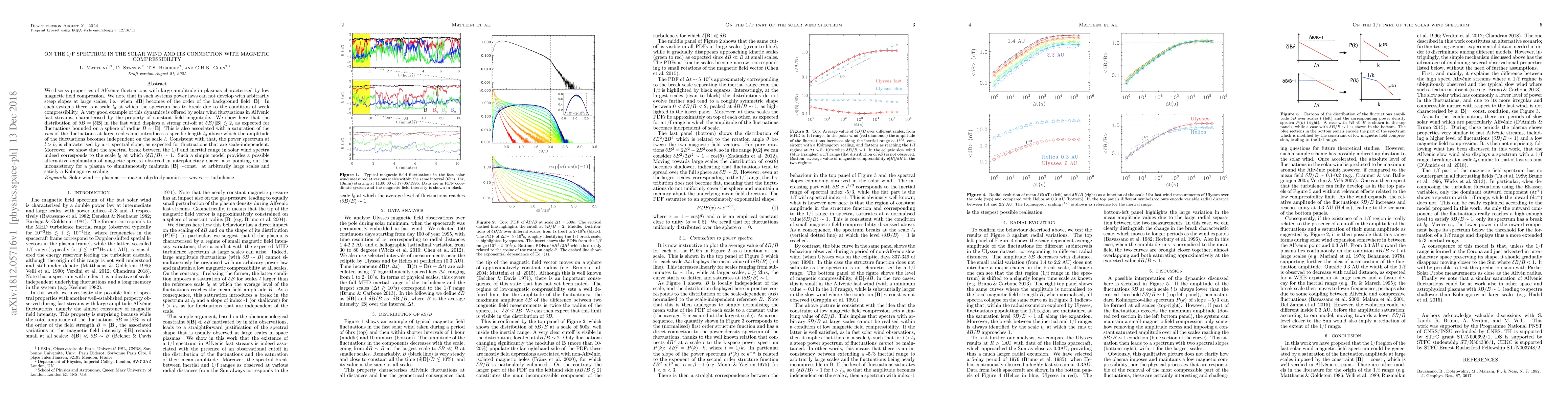 We discuss properties of Alfv\'enic fluctuations with large amplitude in plasmas characterised by low magnetic field compression. We note that in such systems power laws can not develop with arbitrarily steep slopes at large scales, i.e. when $|\delta \bf{B}|$ becomes of the order of the background field $|\bf{B}|$. In such systems there is a scale $l_0$ at which the spectrum has to break due to the condition of weak compressibility. A very good example of this dynamics is offered by solar wind fluctuations in Alfv\'enic fast streams, characterised by the property of constant field magnitude. We show here that the distribution of $\delta B=|\delta \bf{B}|$ in the fast wind displays a strong cut-off at $\delta B/|{\bf B}|\lesssim2$, as expected for fluctuations bounded on a sphere of radius $B=|{\bf B}|$. This is also associated with a saturation of the rms of the fluctuations at large scales and introduces a specific length $l_0$ above which the amplitude of the fluctuations becomes independent on the scale $l$. Consistent with that, the power spectrum at $l>l_0$ is characterised by a -1 spectral slope, as expected for fluctuations that are scale-independent. Moreover, we show that the spectral break between the 1/f and inertial range in solar wind spectra indeed corresponds to the scale $l_0$ at which $\left<\delta B/B\right>\sim1$. Such a simple model provides a possible alternative explanation of magnetic spectra observed in interplanetary space, also pointing out the inconsistency for a plasma to simultaneously maintain $|\bf{B}|\sim$const. at arbitrarily large scales and satisfy a Kolmogorov scaling.