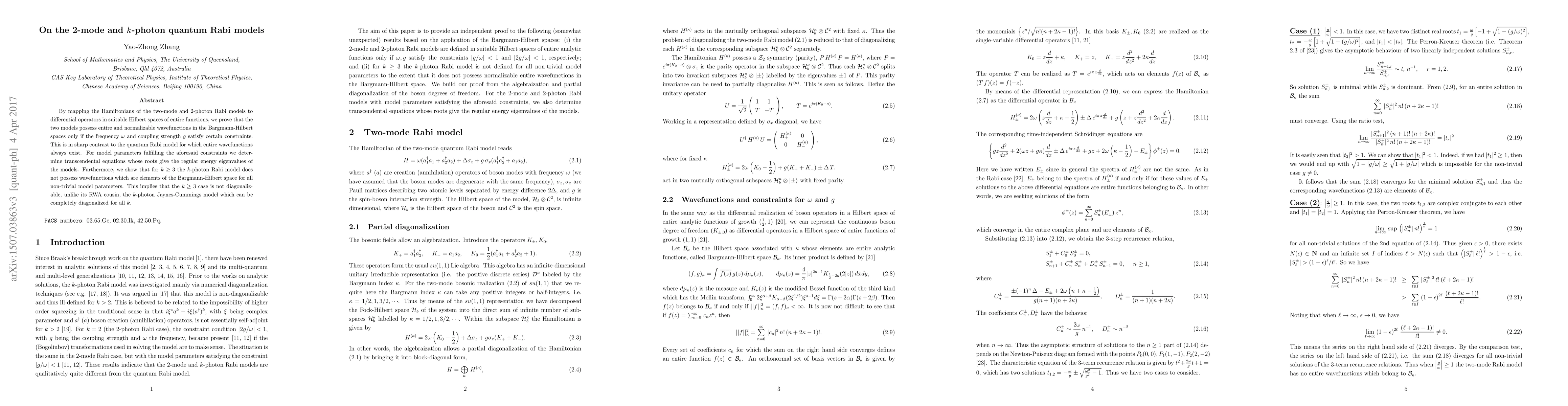 This paper investigates the 2-mode and $k$-photon quantum Rabi models, proving that only under specific constraints on frequency and coupling strength do these models have entire and normalizable wavefunctions. For $k\geq 3$, the $k$-photon Rabi model lacks wavefunctions in the Bargmann-Hilbert space, indicating non-diagonalizability.