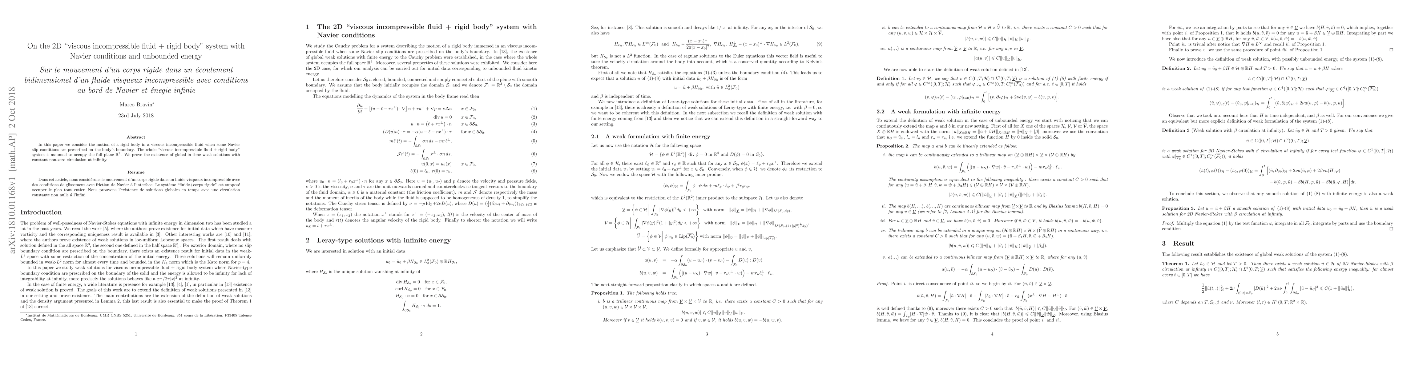 This paper proves the existence of global-in-time weak solutions for a 2D viscous incompressible fluid interacting with a rigid body under Navier slip conditions, with constant non-zero circulation at infinity. The system occupies the entire plane.