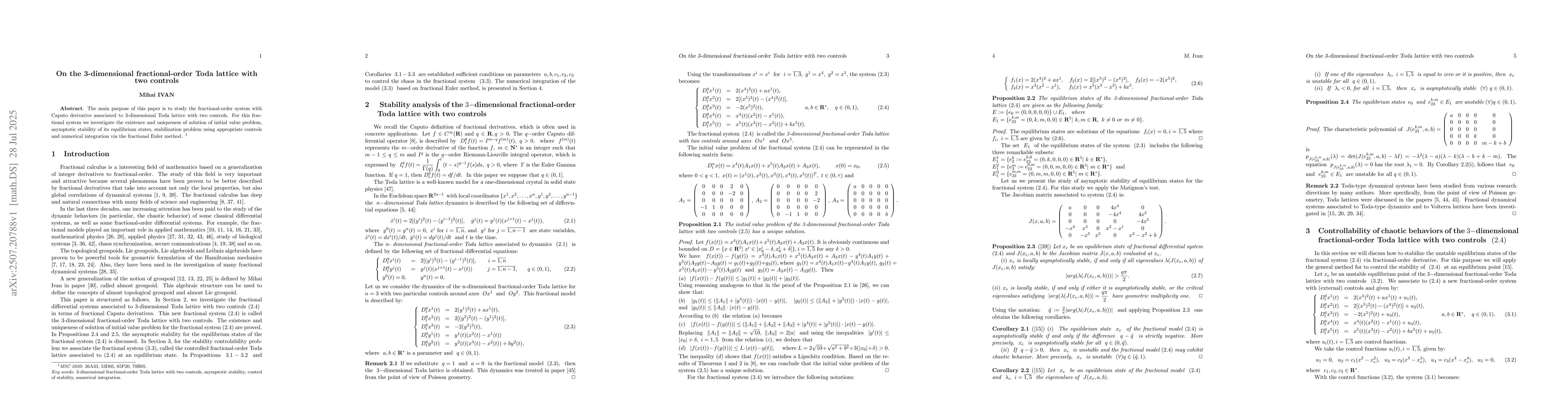 On the 3-dimensional fractional-order Toda lattice with two controls The main purpose of this paper is to study the fractional-order system with Caputo derivative associated to 3-dimensional Toda lattice with two controls. For this fractional system we investigate the existence and uniqueness of solution of initial value problem, asymptotic stability of its equilibrium states, stabilization problem using appropriate controls and numerical integration via the fractional Euler method.