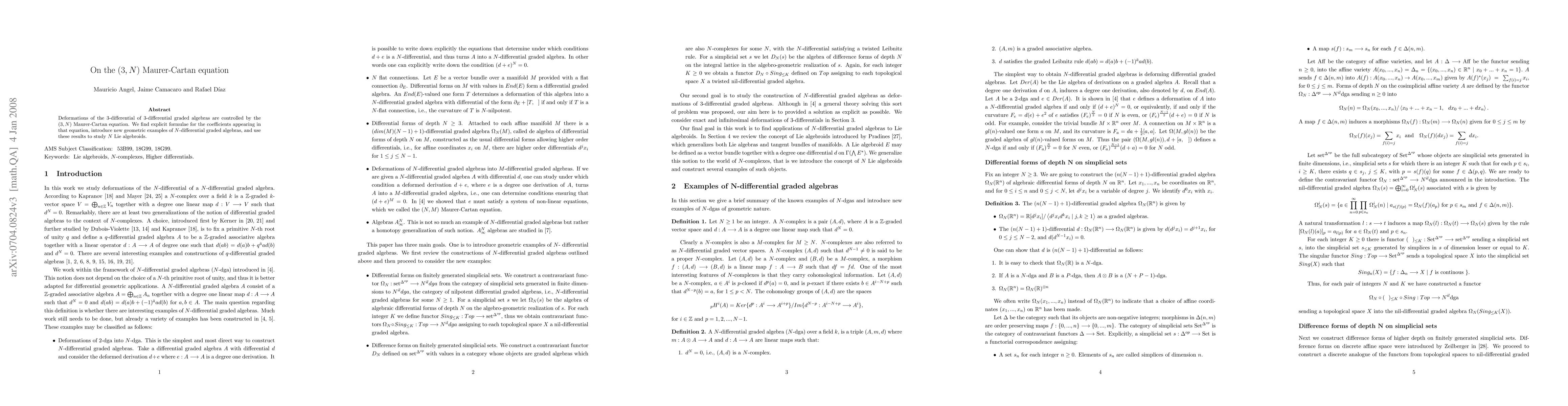 This paper investigates the (3,N) Maurer-Cartan equation governing deformations of 3-differentials in 3-differential graded algebras, deriving explicit formulae for its coefficients and exploring new geometric examples of N-differential graded algebras to better understand N Lie algebroids.