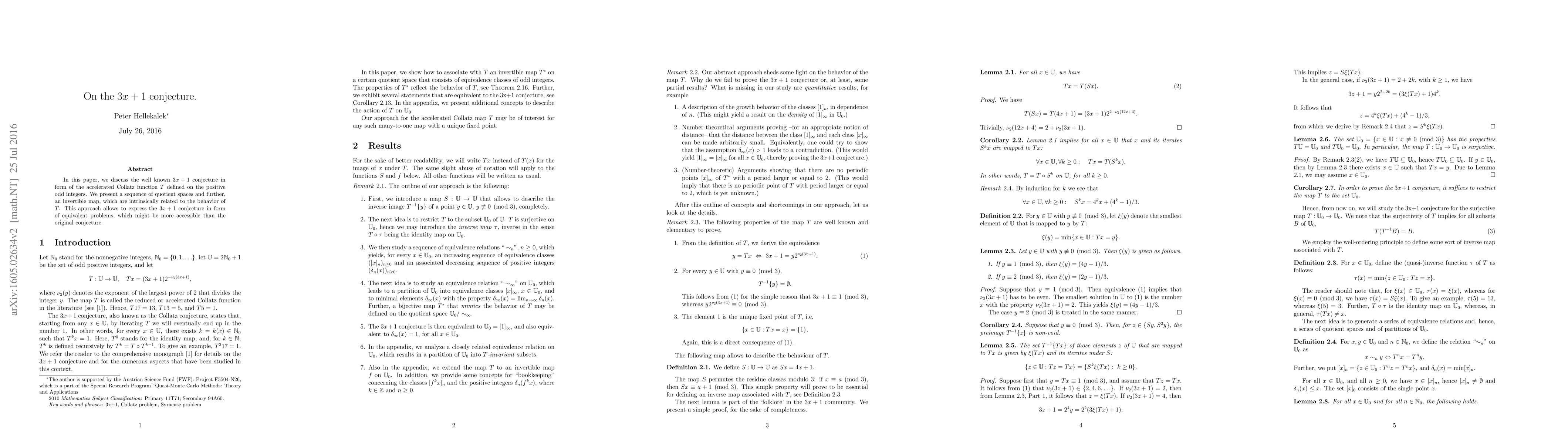 This paper explores the 3x+1 conjecture through the accelerated Collatz function T on positive odd integers, introducing a sequence of quotient spaces and an invertible map to express the conjecture in more approachable equivalent forms.