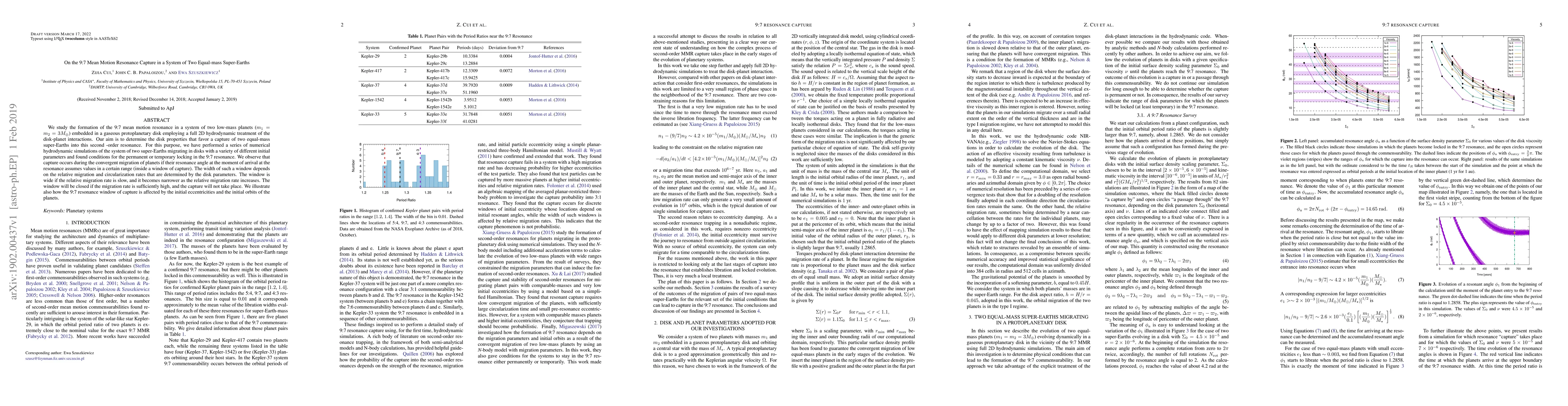 This research investigates the conditions under which two equal-mass super-Earths can be captured in a 9:7 mean motion resonance within a gaseous protoplanetary disk, using numerical simulations. It finds that capture is favored by slow relative migration rates and specific initial conditions, while high migration rates prevent resonance capture.