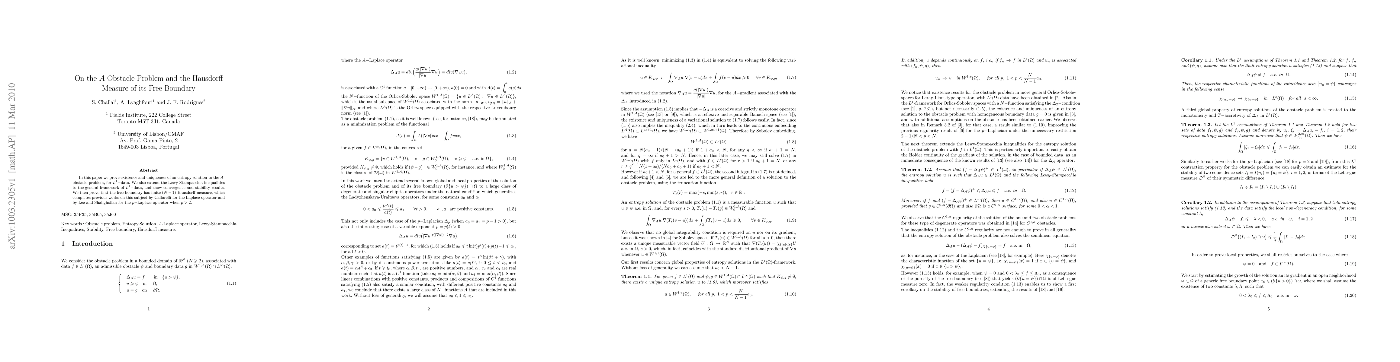 In this paper we prove existence and uniqueness of an entropy solution to the A-obstacle problem, for L^1 data. We also extend the Lewy-Stampacchia inequalities to the general framework of L^1 data, and show convergence and stability results. We then prove that the free boundary has finite N-1 Hausdorff measure, which completes previous works on this subject by Caffarelli for the Laplace operator and by Lee and Shahgholian for the p-Laplace operator when p>2.