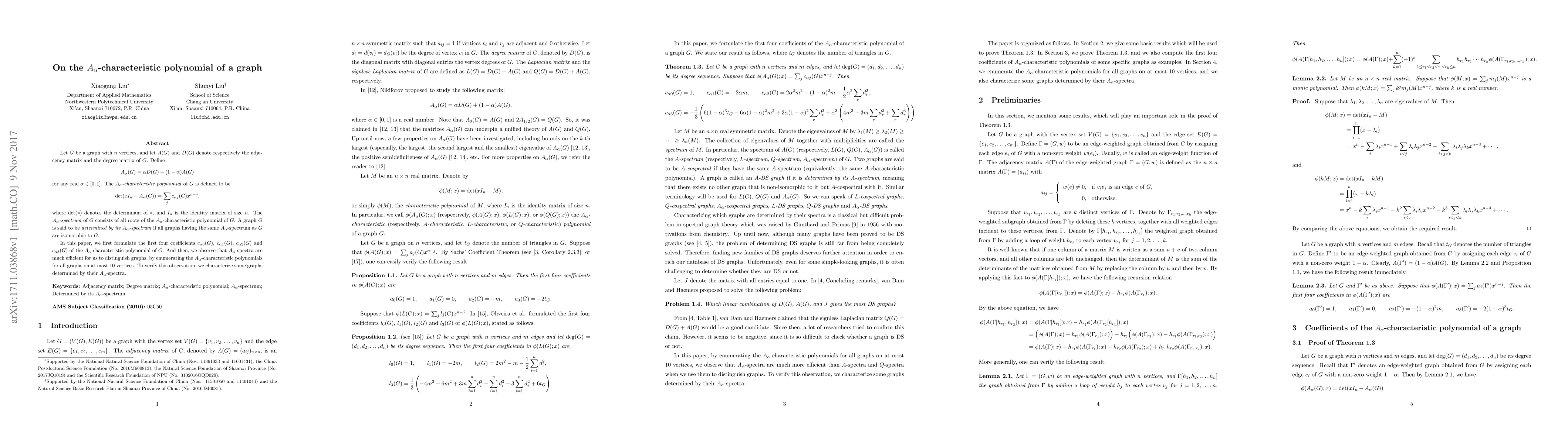 Let $G$ be a graph with $n$ vertices, and let $A(G)$ and $D(G)$ denote respectively the adjacency matrix and the degree matrix of $G$. Define $$ A_{\alpha}(G)=\alpha D(G)+(1-\alpha)A(G) $$ for any real $\alpha\in [0,1]$. The $A_{\alpha}$-characteristic polynomial of $G$ is defined to be $$ \det(xI_n-A_{\alpha}(G))=\sum_jc_{\alpha j}(G)x^{n-j}, $$ where $\det(*)$ denotes the determinant of $*$, and $I_n$ is the identity matrix of size $n$. The $A_{\alpha}$-spectrum of $G$ consists of all roots of the $A_{\alpha}$-characteristic polynomial of $G$. A graph $G$ is said to be determined by its $A_{\alpha}$-spectrum if all graphs having the same $A_{\alpha}$-spectrum as $G$ are isomorphic to $G$. In this paper, we first formulate the first four coefficients $c_{\alpha 0}(G)$, $c_{\alpha 1}(G)$, $c_{\alpha 2}(G)$ and $c_{\alpha 3}(G)$ of the $A_{\alpha}$-characteristic polynomial of $G$. And then, we observe that $A_{\alpha}$-spectra are much efficient for us to distinguish graphs, by enumerating the $A_{\alpha}$-characteristic polynomials for all graphs on at most 10 vertices. To verify this observation, we characterize some graphs determined by their $A_{\alpha}$-spectra.