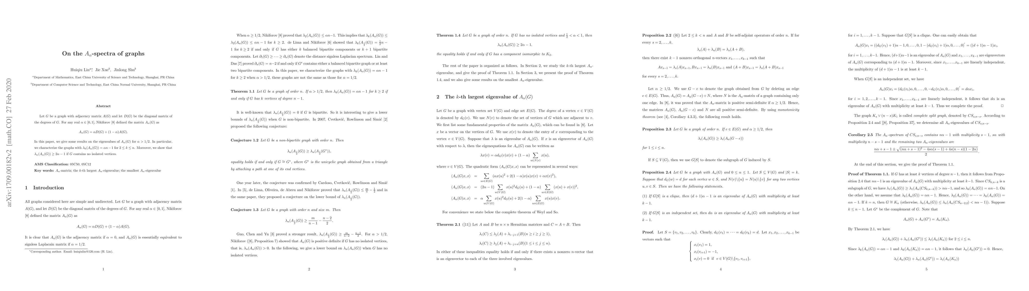 Let $G$ be a graph with adjacency matrix $A(G)$ and let $D(G)$ be the diagonal matrix of the degrees of $G$. For any real $\alpha\in [0,1]$, Nikiforov \cite{VN1} defined the matrix $A_{\alpha}(G)$ as $$A_{\alpha}(G)=\alpha D(G)+(1-\alpha)A(G).$$ In this paper, we give some results on the eigenvalues of $A_{\alpha}(G)$ with $\alpha>1/2$. In particular, we show that for each $e\notin E(G)$, $\lambda_i(A_{\alpha}(G+e))\geq\lambda_i(A_{\alpha}(G))$. By utilizing the result, we prove have $\lambda_k(A_{\alpha}(G))\leq\alpha n-1$ for $2\leq k\leq n$. Moreover, we characterize the extremal graphs with equality holding. Finally, we show that $\lambda_n(A_{\alpha}({G}))\geq 2\alpha-1$ if $G$ contains no isolated vertices.