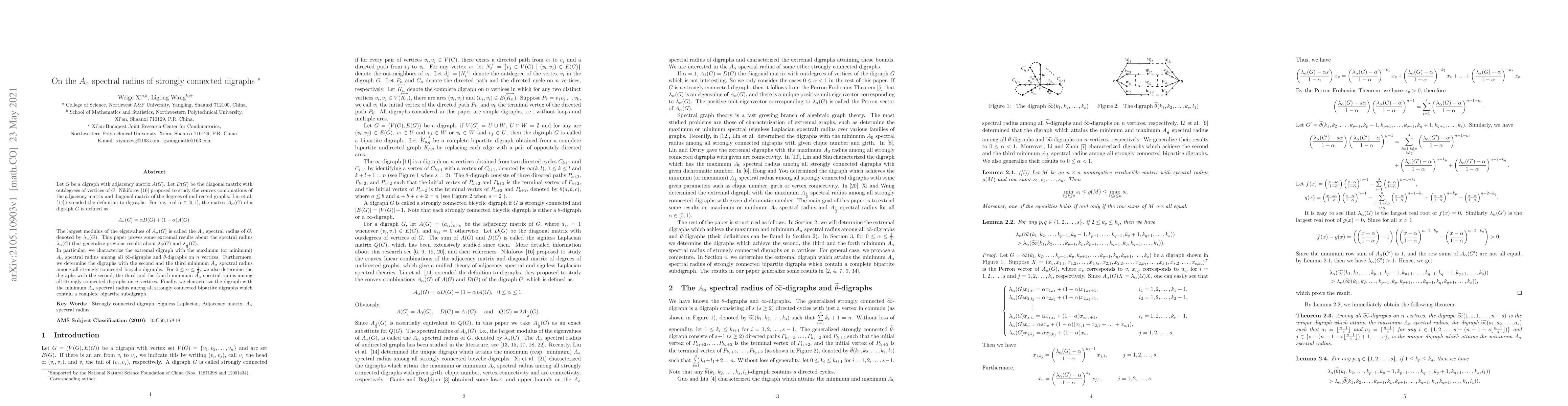 Let $G$ be a digraph with adjacency matrix $A(G)$. Let $D(G)$ be the diagonal matrix with outdegrees of vertices of $G$. Nikiforov \cite{Niki} proposed to study the convex combinations of the adjacency matrix and diagonal matrix of the degrees of undirected graphs. Liu et al. \cite{LWCL} extended the definition to digraphs. For any real $\alpha\in[0,1]$, the matrix $A_\alpha(G)$ of a digraph $G$ is defined as $$A_\alpha(G)=\alpha D(G)+(1-\alpha)A(G).$$ The largest modulus of the eigenvalues of $A_\alpha(G)$ is called the $A_\alpha$ spectral radius of $G$, denoted by $\lambda_\alpha(G)$. This paper proves some extremal results about the spectral radius $\lambda_\alpha(G)$ that generalize previous results about $\lambda_0(G)$ and $\lambda_{\frac{1}{2}}(G)$. In particular, we characterize the extremal digraph with the maximum (or minimum) $A_\alpha$ spectral radius among all $\widetilde{\infty}$-digraphs and $\widetilde{\theta}$-digraphs on $n$ vertices. Furthermore, we determine the digraphs with the second and the third minimum $A_\alpha$ spectral radius among all strongly connected bicyclic digraphs. For $0\leq\alpha\leq\frac{1}{2}$, we also determine the digraphs with the second, the third and the fourth minimum $A_\alpha$ spectral radius among all strongly connected digraphs on $n$ vertices. Finally, we characterize the digraph with the minimum $A_\alpha$ spectral radius among all strongly connected bipartite digraphs which contain a complete bipartite subdigraph.