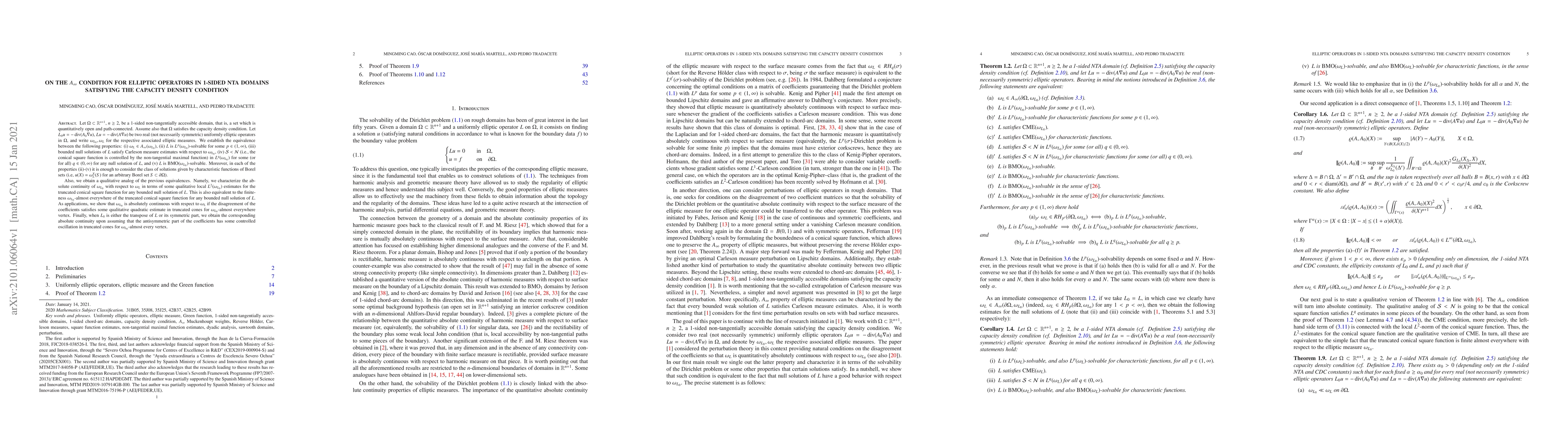 This paper investigates the equivalence of various properties for elliptic operators in 1-sided non-tangentially accessible domains satisfying the capacity density condition. It establishes the equivalence between $A_{\infty}$ condition, $L^p$-solvability, Carleson measure estimates, and control of the conical square function, among other properties. It also characterizes the absolute continuity of elliptic measures in terms of local $L^2$ estimates and provides applications to the absolute continuity of measures under certain coefficient conditions.