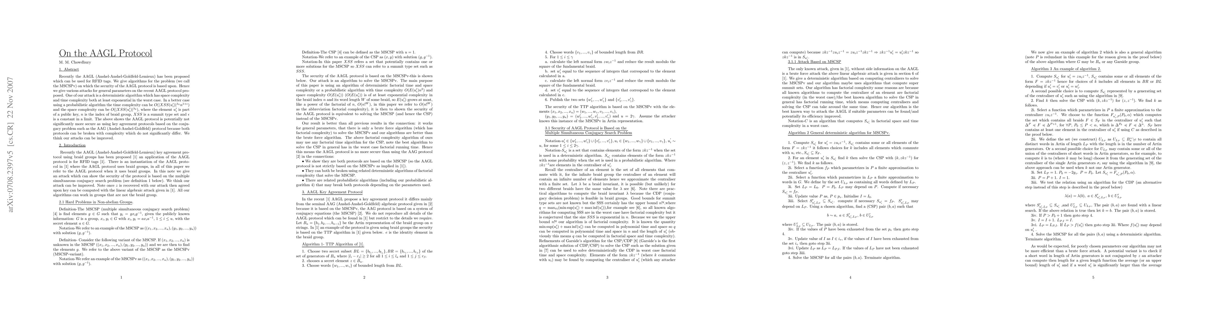 Recently the AAGL (Anshel-Anshel-Goldfeld-Lemieux) has been proposed which can be used for RFID tags. We give algorithms for the problem (we call the MSCSPv) on which the security of the AAGL protocol is based upon. Hence we give various attacks for general parameters on the recent AAGL protocol proposed. One of our attacks is a deterministic algorithm which has space complexity and time complexity both atleast exponentialin the worst case. In a better case using a probabilistic algorithm the time complexity canbe O(|XSS(ui')^L5*(n^(1+e)) and the space complexity can be O(|XSS(ui')|^L6), where the element ui' is part of a public key, n is the index of braid group, XSS is a summit type set and e is a constant in a limit. The above shows the AAGL protocol is potentially not significantly more secure as using key agreement protocols based on the conjugacy problem such as the AAG (Anshel-Anshel-Goldfeld) protocol because both protocols can be broken with complexity which do not significantly differ. We think our attacks can be improved.