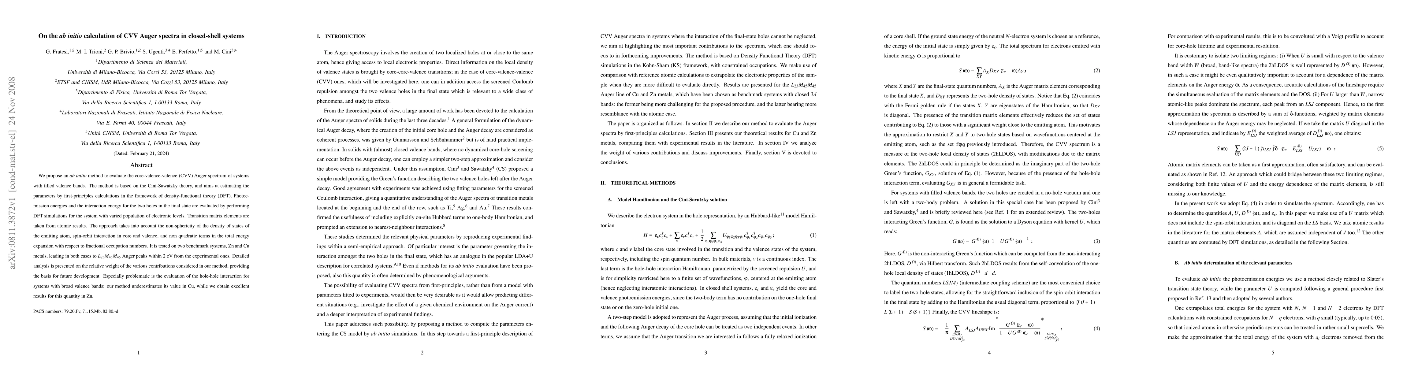 This paper proposes an ab initio method for calculating CVV Auger spectra in closed-shell systems based on the Cini-Sawatzky theory and DFT, achieving accurate L23M45M45 peaks for Zn and Cu within 2 eV of experimental values, though it struggles to accurately evaluate the hole-hole interaction in Cu.