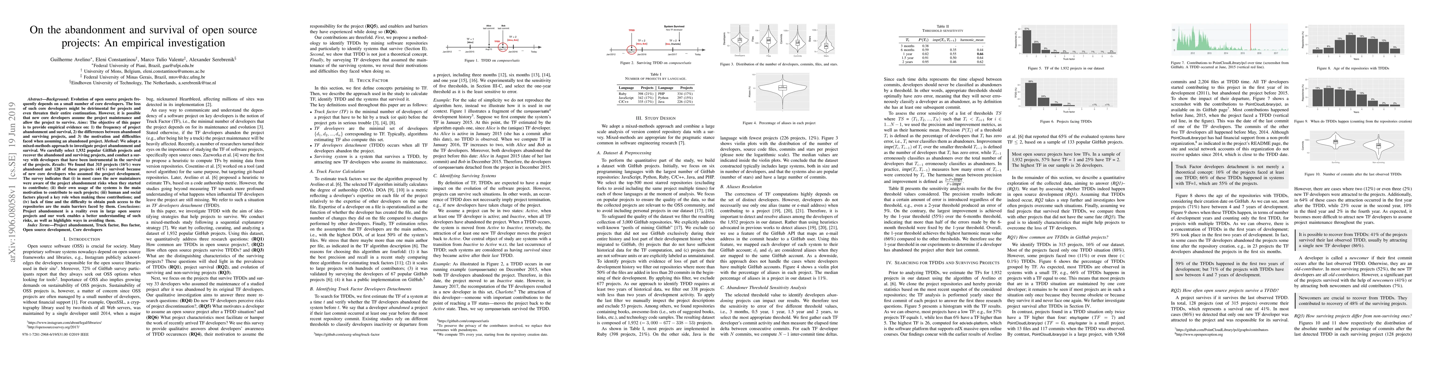 Background: Evolution of open source projects frequently depends on a small number of core developers. The loss of such core developers might be detrimental for projects and even threaten their entire continuation. However, it is possible that new core developers assume the project maintenance and allow the project to survive. Aims: The objective of this paper is to provide empirical evidence on: 1) the frequency of project abandonment and survival, 2) the differences between abandoned and surviving projects, and 3) the motivation and difficulties faced when assuming an abandoned project. Method: We adopt a mixed-methods approach to investigate project abandonment and survival. We carefully select 1,932 popular GitHub projects and recover the abandoned and surviving projects, and conduct a survey with developers that have been instrumental in the survival of the projects. Results: We found that 315 projects (16%) were abandoned and 128 of these projects (41%) survived because of new core developers who assumed the project development. The survey indicates that (i) in most cases the new maintainers were aware of the project abandonment risks when they started to contribute; (ii) their own usage of the systems is the main motivation to contribute to such projects; (iii) human and social factors played a key role when making these contributions; and (iv) lack of time and the difficulty to obtain push access to the repositories are the main barriers faced by them. Conclusions: Project abandonment is a reality even in large open source projects and our work enables a better understanding of such risks, as well as highlights ways in avoiding them.