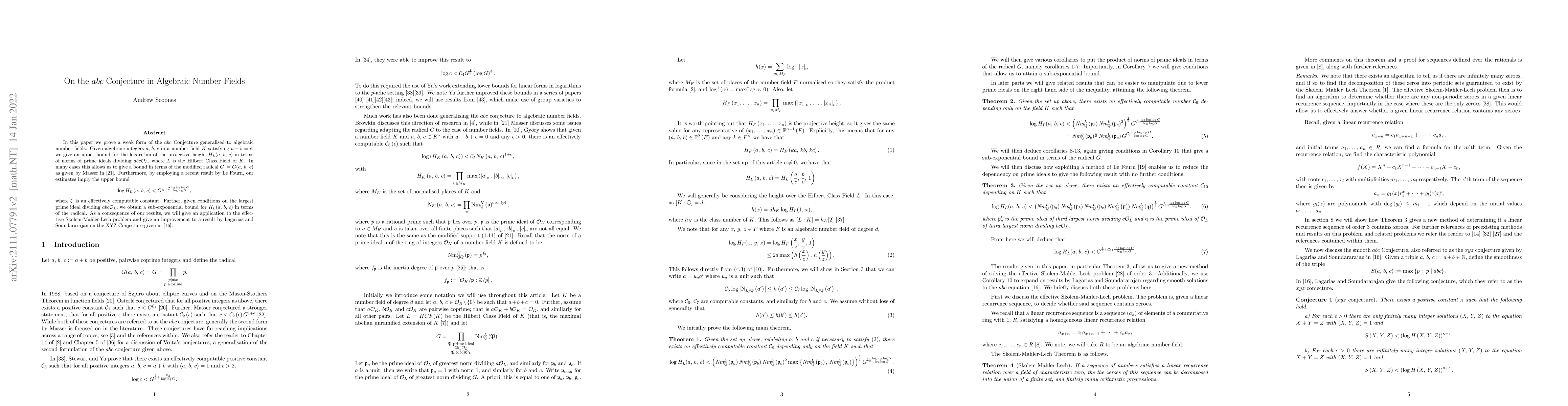 While currently the $abc$ conjecture and work towards it remains open or is disputed, at the same time much work has been done on weaker versions, as well as on its generalisation to number fields. Given integers satisfying $a+b=c$, Stewart and Yu were able to give an exponential bound for $\max(a,\,b,\,c)$ in terms of the radical over the integers, while Gy\"{o}ry was able to give an exponential bound in the algebraic number field case for the projective height $H_{K}(a,\,b,\,c)$ in terms of the radical for algebraic numbers. We generalise Stewart and Yu's method to give an improvement on Gy\"{o}ry's bound for algebraic integers. Finally, we will give an application to the effective Skolem-Mahler-Lech problem. Of importance is to note that, given some conditions, we obtain a sub-exponential bound for $\log H_{L}(a,\,b,\,c)$. We use these results to give an improvement on a result by Lagarias and Soundararajan. At the final stages of preparation, we were made aware that a similar result to our main theorem has been obtained independently by Gy\"ory, using different methods.