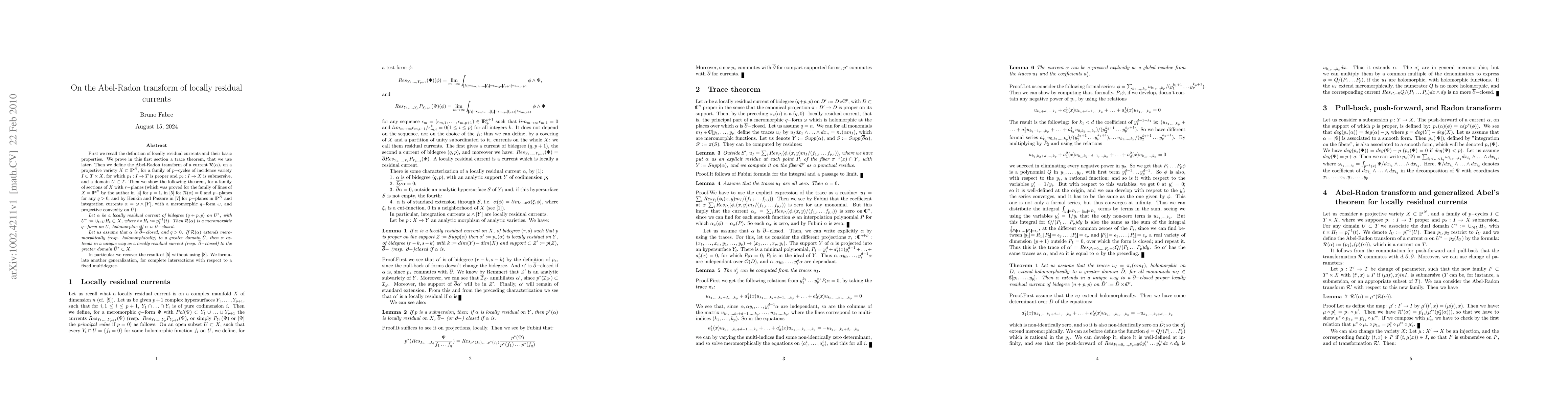 First we recall the definition of locally residual currents and their basic properties. We prove in this first section a trace theorem, that we use later. Then we define the Abel-Radon transform of a current ${\cal R}(\alpha)$, on a projective variety $X\subset \P^N$, for a family of $p-$cycles of incidence variety $I\subset T\times X$, for which $p_1:I\to T$ is proper and $p_2:I\to X$ is submersive, and a domain $U\subset T$. Then we show the following theorem, for a family of sections of $X$ with $r-$planes (which was proved for the family of lines of $X=\P^N$ by the author for $p=1$, for ${\cal R}(\alpha)=0$ and $p-$planes for any $q>0$, and by Henkin and Passare for $p-$planes in $\P^N$ and integration currents $\alpha=\omega\wedge[Y]$, with a meromorphic $q-$form $\omega$, and projective convexity on $\tilde U$): Let $\alpha$ be a locally residual current of bidegree $(q+p,p)$ on $U^*$, with $U^*:=\cup_{t\in U}{H_t}\subset X$, where ${t}\times H_t:=p_1^{-1}(t)$. Then ${\cal R}(\alpha)$ is a meromorphic $q-$form on $U$, holomorphic iff $\alpha$ is $\bar{\partial}-$closed. Let us assume that $\alpha$ is $\bar\partial-$closed, and $q>0$. If ${\cal R}(\alpha)$ extends meromorphically (resp. holomorphically) to a greater domain $\tilde U$, then $\alpha$ extends in a unique way as a locally residual current (resp. $\bar\partial-$closed) to the greater domain ${\tilde U}^*\subset X$.