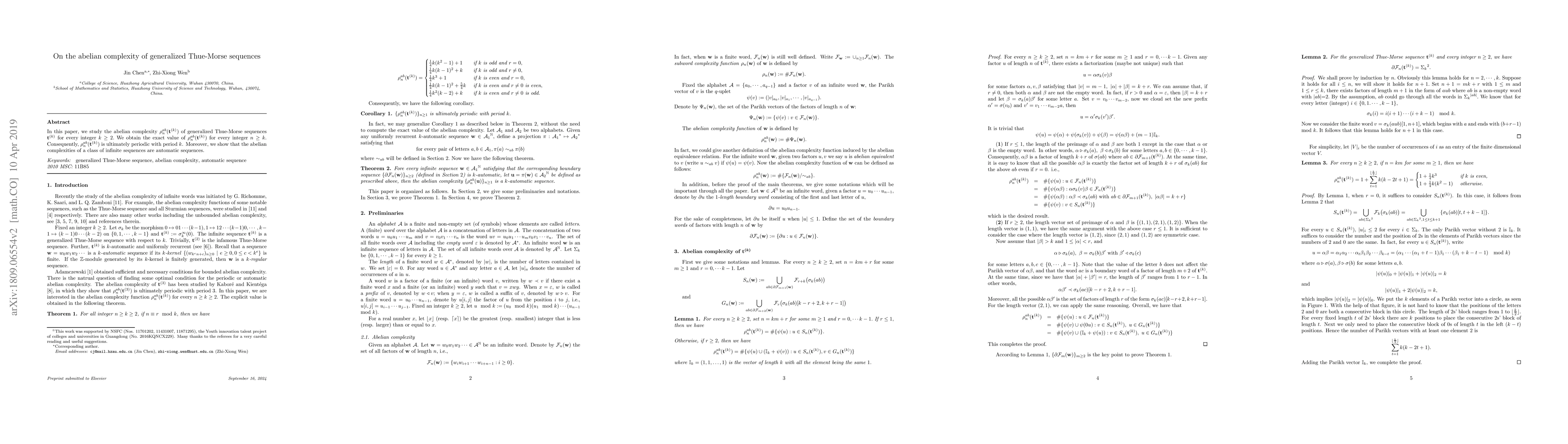This paper investigates the abelian complexity of generalized Thue-Morse sequences, determining that $\rho_n^{ab}(\mathbf{t}^{(k)})$ is ultimately periodic with period $k$ and $k$-automatic for a class of infinite sequences.