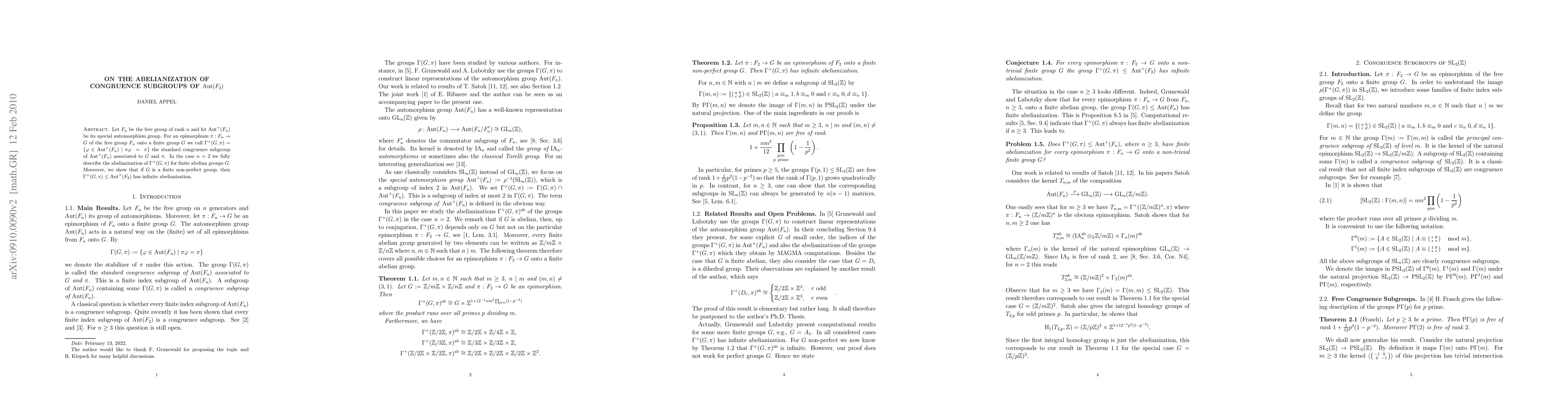 This paper describes the abelianization of the standard congruence subgroup associated with a finite abelian group G in the special automorphism group of the free group of rank 2. It also proves that for non-perfect finite groups G, the subgroup has an infinite abelianization.