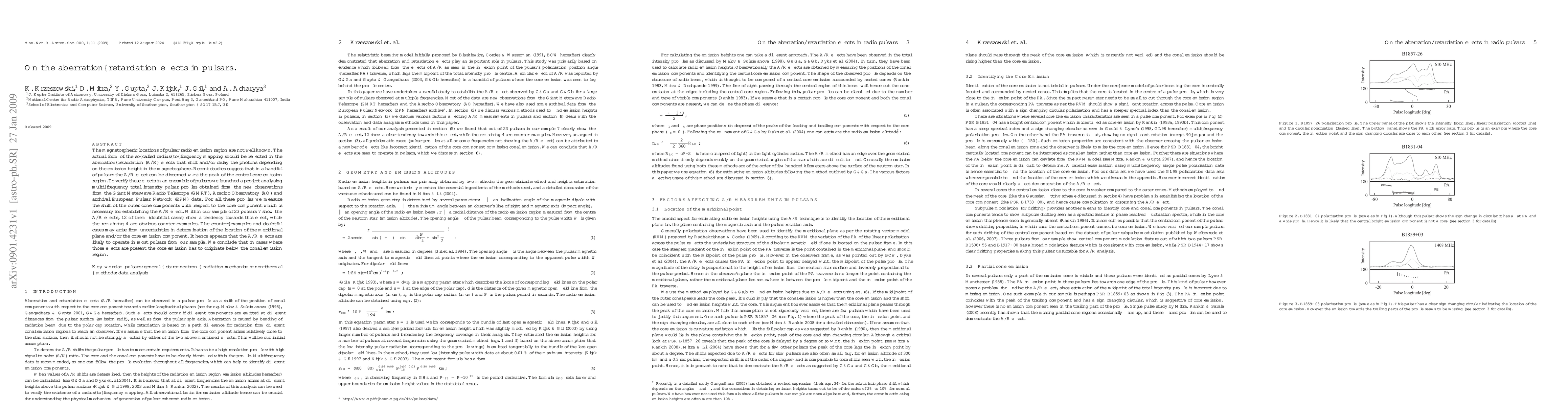 Researchers studied 23 pulsars to determine if their radio emission regions show aberration-retardation effects, which shift photons based on their height in the magnetosphere. Most pulsars (17 out of 23) were found to exhibit these effects, suggesting that core emission originates below the conal emission region.