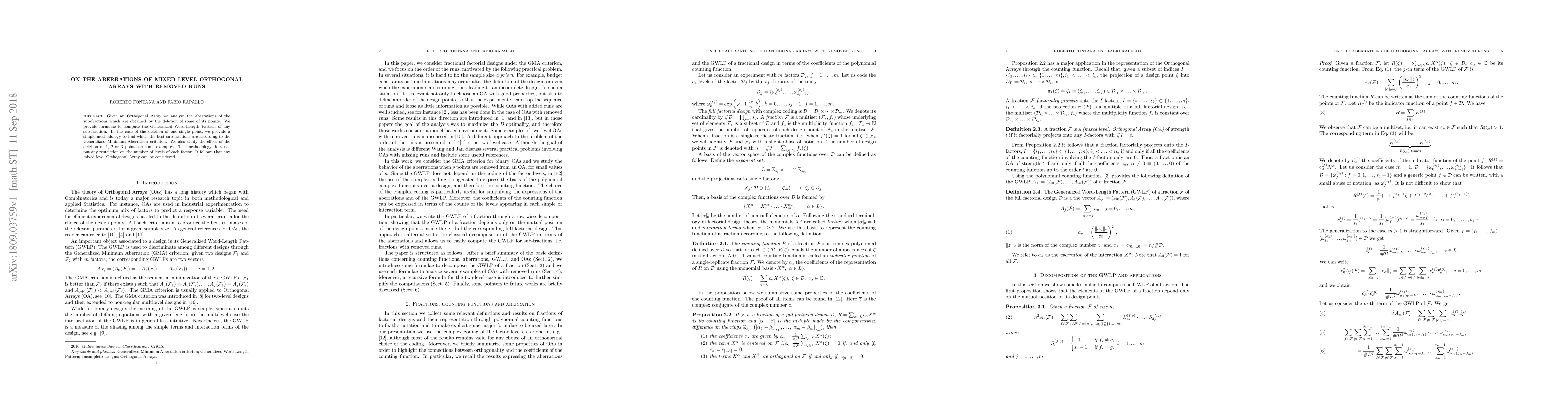 Given an Orthogonal Array we analyze the aberrations of the sub-fractions which are obtained by the deletion of some of its points. We provide formulae to compute the Generalized Word-Length Pattern of any sub-fraction. In the case of the deletion of one single point, we provide a simple methodology to find which the best sub-fractions are according to the Generalized Minimum Aberration criterion. We also study the effect of the deletion of 1, 2 or 3 points on some examples. The methodology does not put any restriction on the number of levels of each factor. It follows that any mixed level Orthogonal Array can be considered.