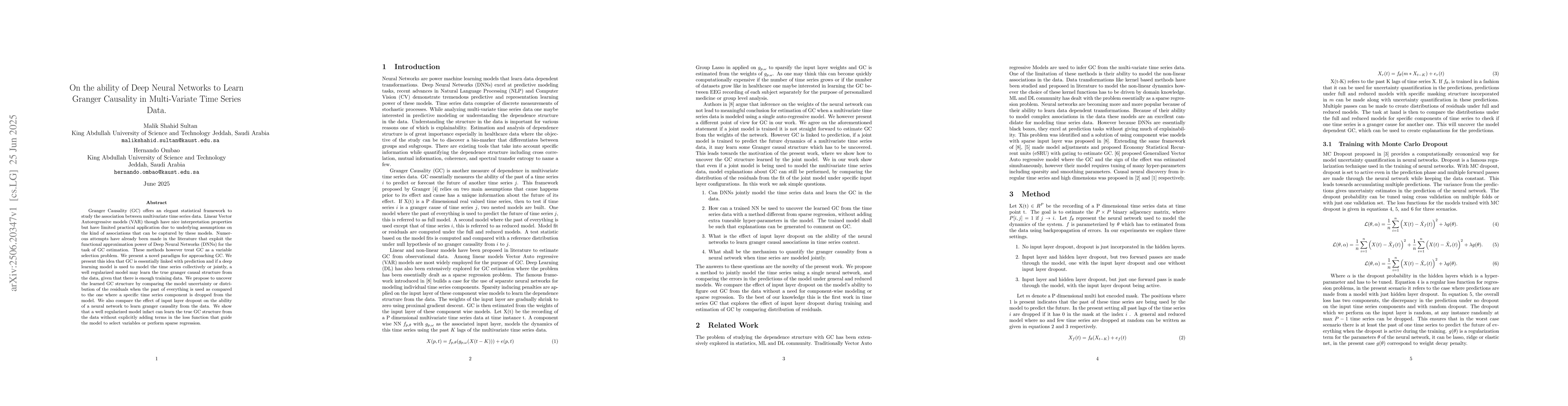 Granger Causality (GC) offers an elegant statistical framework to study the association between multivariate time series data. Linear Vector Autoregressive models (VAR) though have nice interpretation properties but have limited practical application due to underlying assumptions on the kind of associations that can be captured by these models. Numerous attempts have already been made in the literature that exploit the functional approximation power of Deep Neural Networks (DNNs) for the task of GC estimation. These methods however treat GC as a variable selection problem. We present a novel paradigm for approaching GC. We present this idea that GC is essentially linked with prediction and if a deep learning model is used to model the time series collectively or jointly, a well regularized model may learn the true granger causal structure from the data, given that there is enough training data. We propose to uncover the learned GC structure by comparing the model uncertainty or distribution of the residuals when the past of everything is used as compared to the one where a specific time series component is dropped from the model. We also compare the effect of input layer dropout on the ability of a neural network to learn granger causality from the data. We show that a well regularized model infact can learn the true GC structure from the data without explicitly adding terms in the loss function that guide the model to select variables or perform sparse regression.