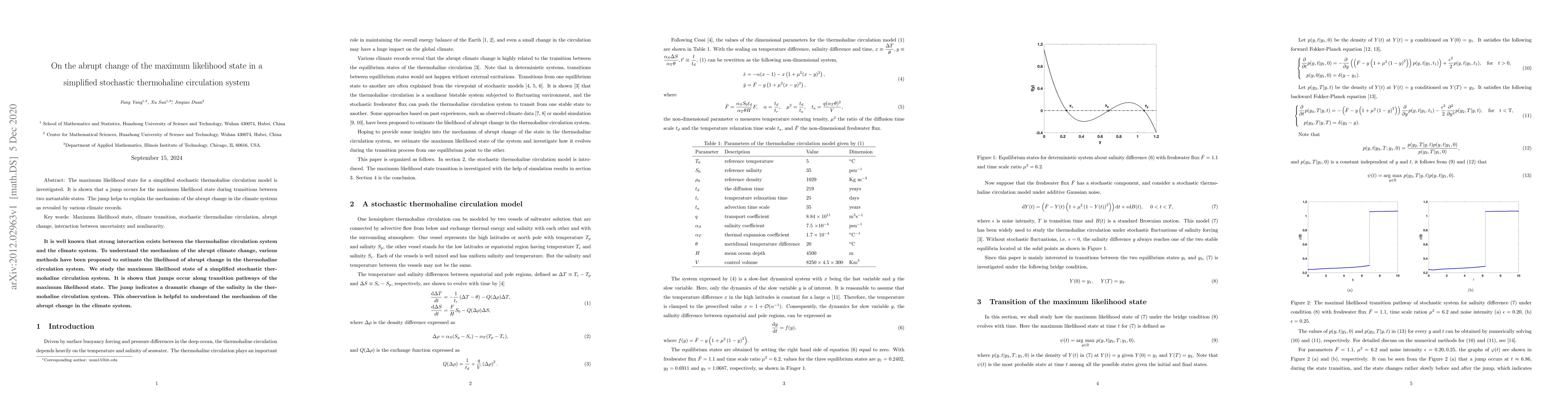 The study investigates a simplified stochastic thermohaline circulation model, revealing a jump in the maximum likelihood state during transitions between metastable states, which elucidates mechanisms behind abrupt climate changes.