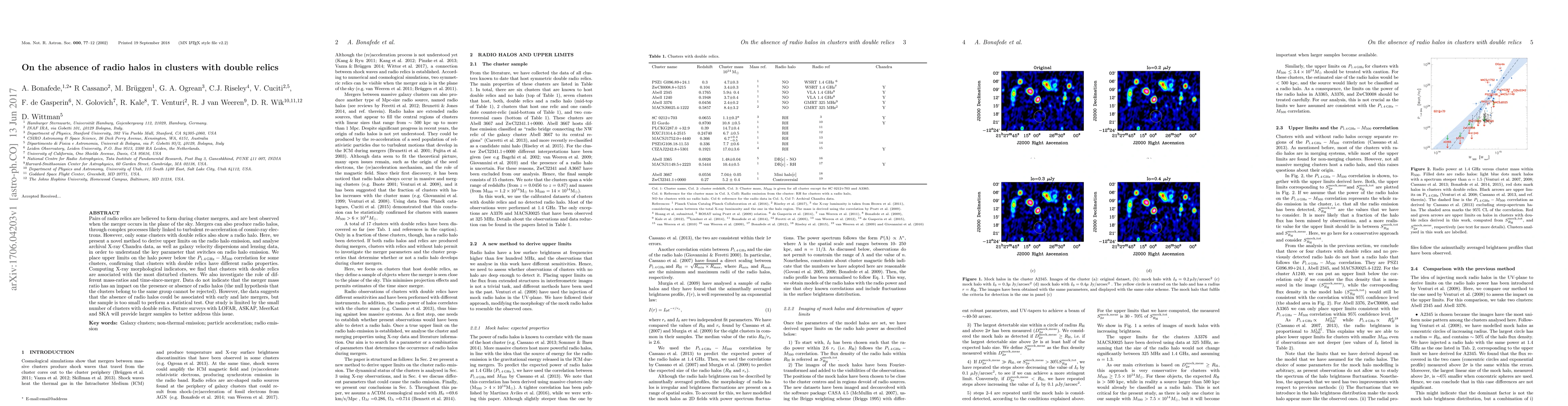 This paper investigates why some galaxy clusters with double radio relics lack radio halos, employing a new method to derive upper limits on radio halo emission and analyzing X-ray, galaxy velocity, and lensing data. The study suggests that the absence of radio halos may correlate with early and late merger stages, though the small sample size limits definitive conclusions.