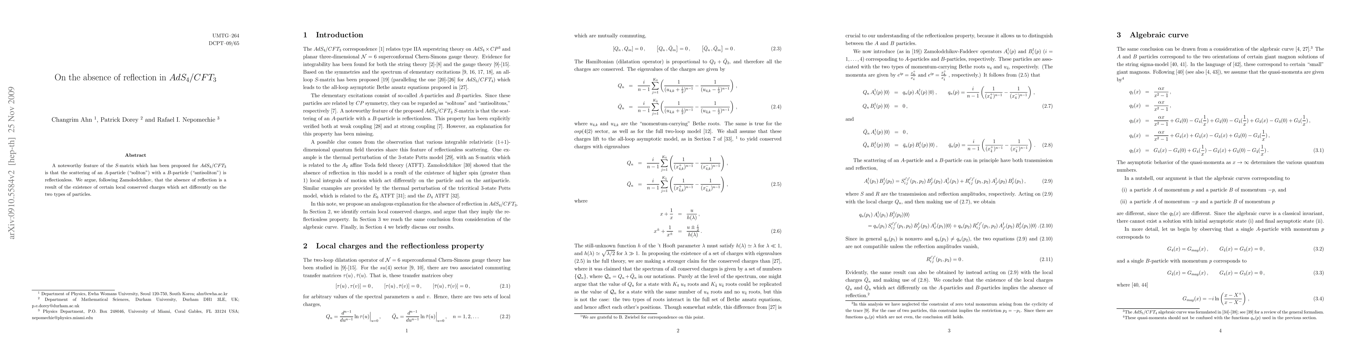 A noteworthy feature of the S-matrix which has been proposed for AdS4/CFT3 is that the scattering of an A-particle ("soliton") with a B-particle ("antisoliton") is reflectionless. We argue, following Zamolodchikov, that the absence of reflection is a result of the existence of certain local conserved charges which act differently on the two types of particles.